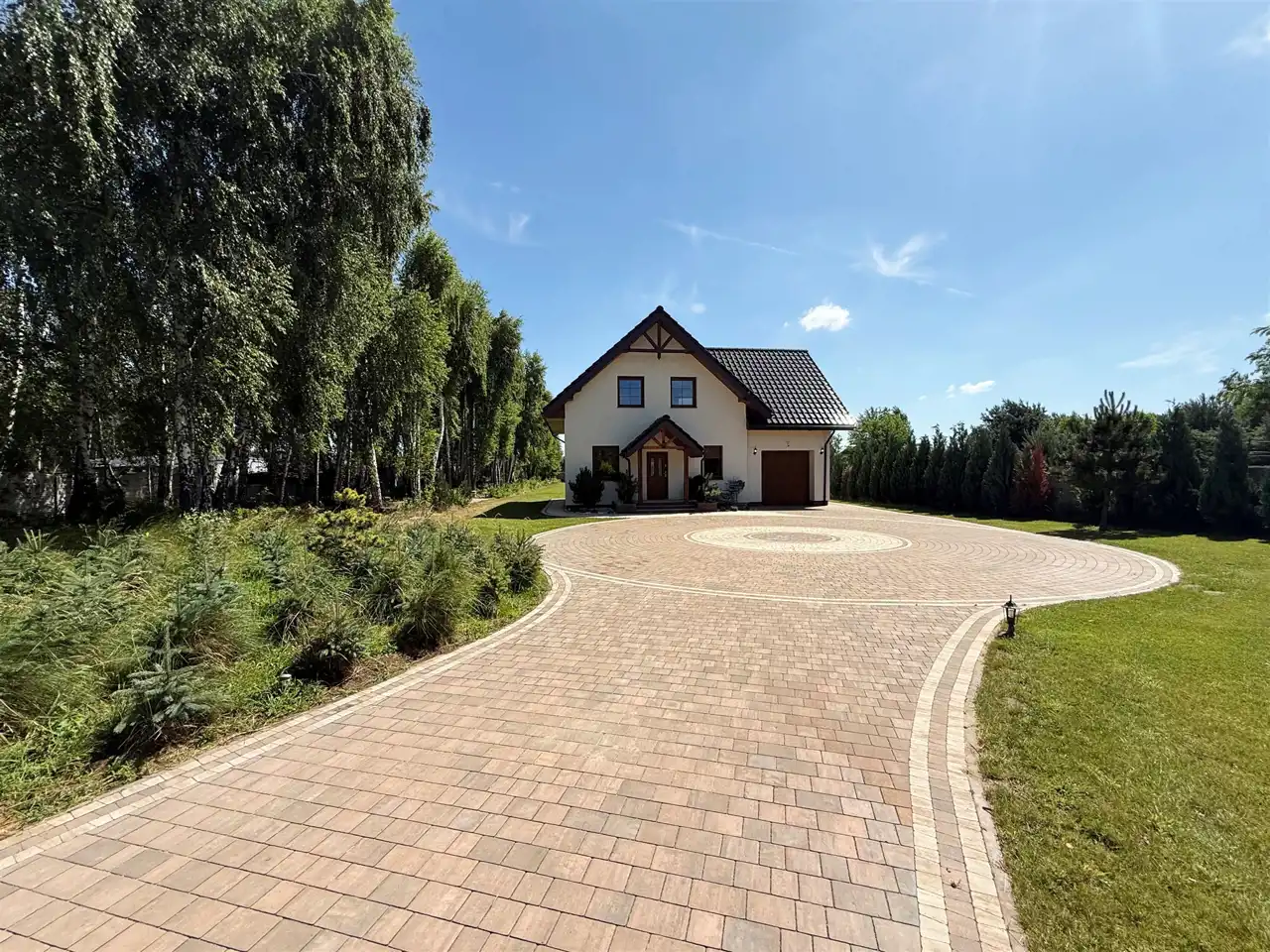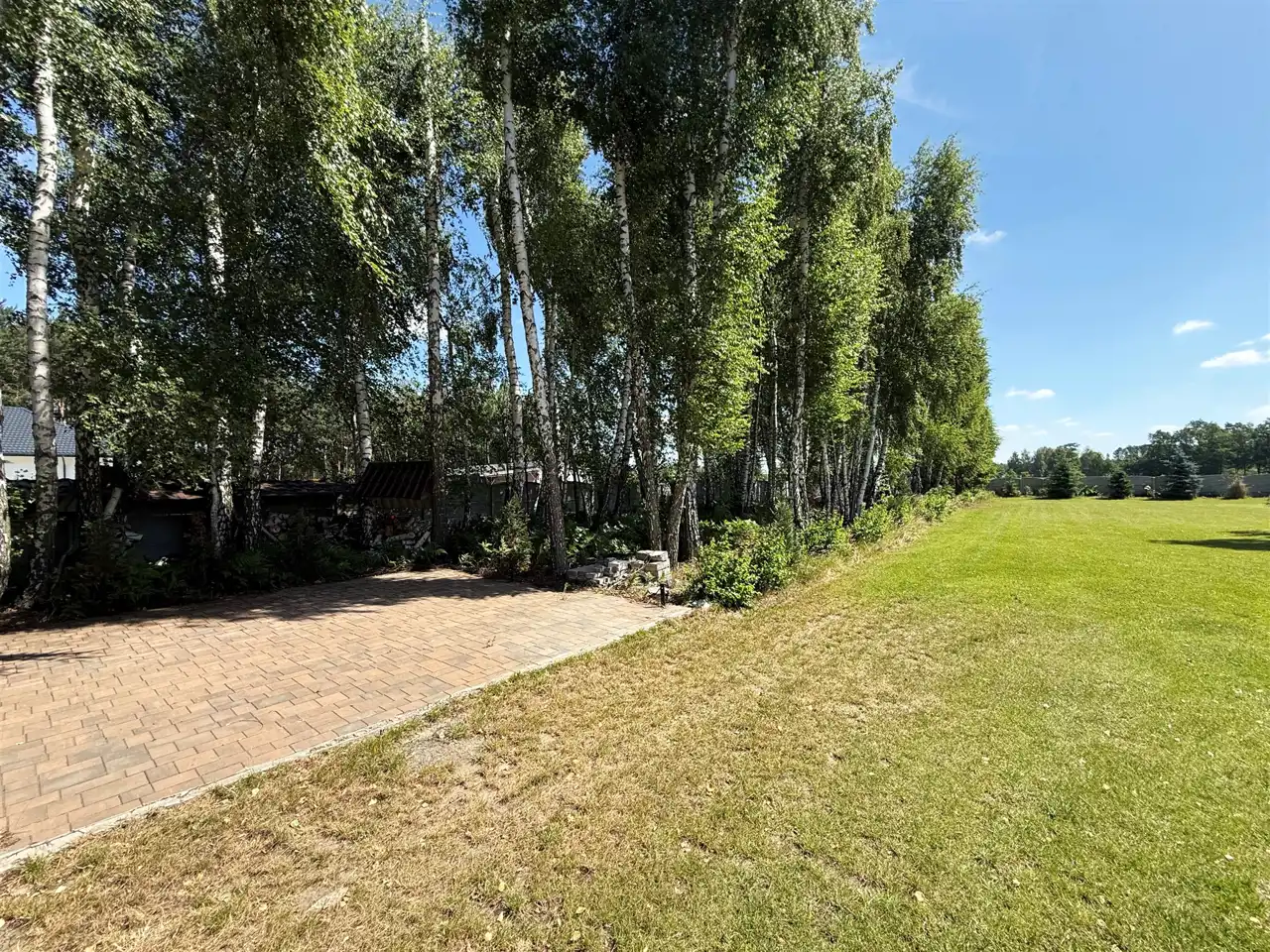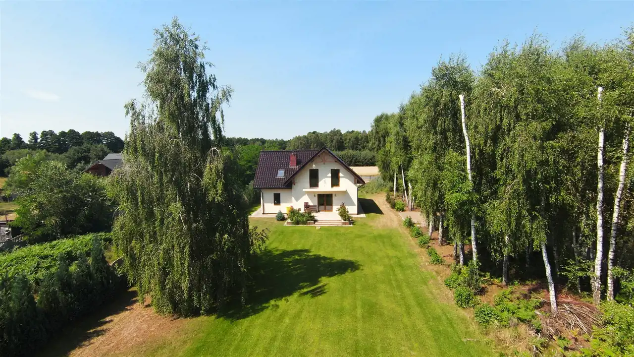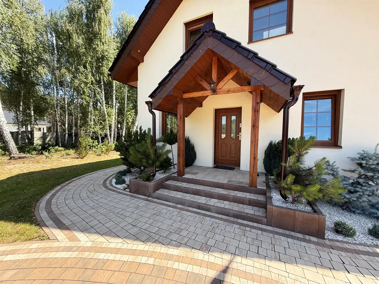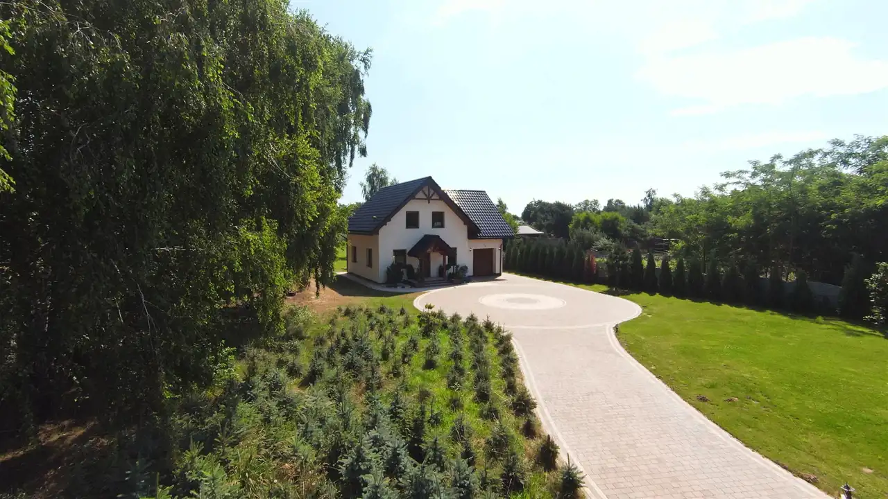 Front działki zagospodarowany wjazdem z kostki brukowej oraz trawnikiem z drzewami iglastymi i z roślinami ozdobnymi, lewa strona działki stanowi lasek brzozowy.
