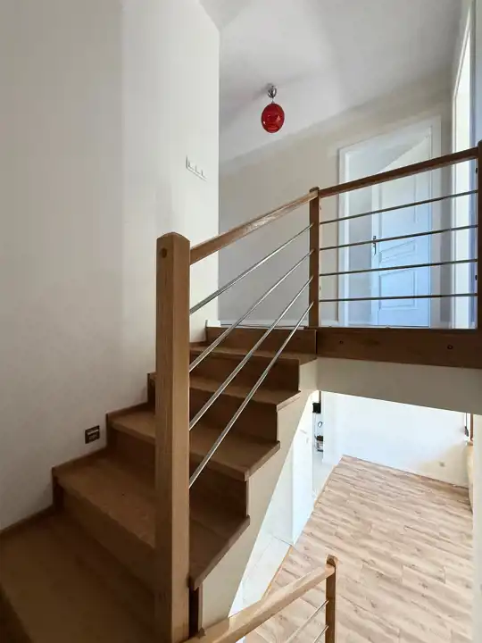 * Parter: Wiatrołap, salon z aneksem kuchennym oraz z wyjściem na taras, łazienka razem z wc, garaż, kotłownia, na poddasze prowadzą schody drewniane z poręczą.
