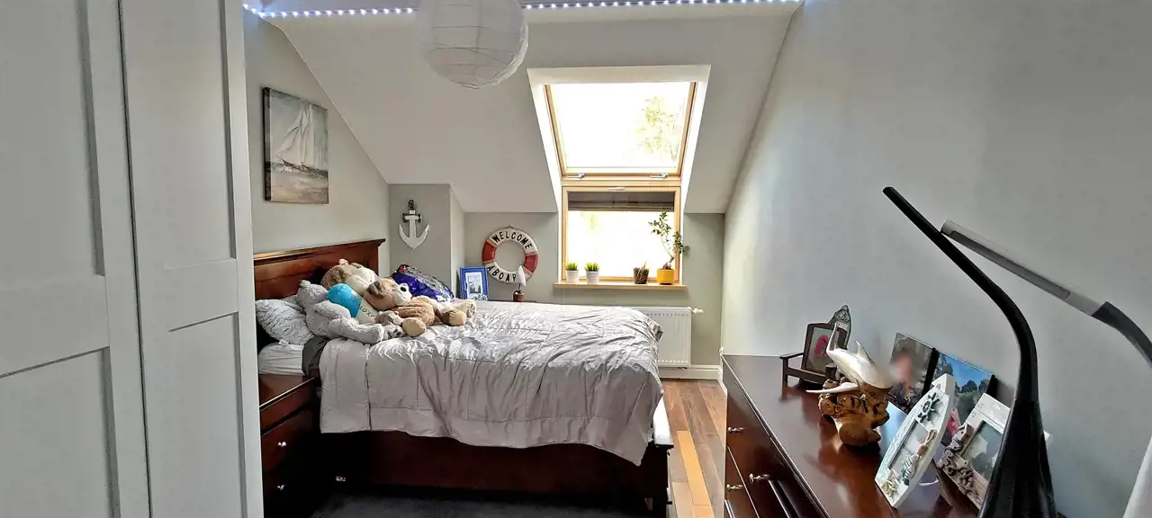 Sypialnie na piętrze wyposażone w grzejniki ścienne, a łazienka dodatkowo w panel podczerwieni.