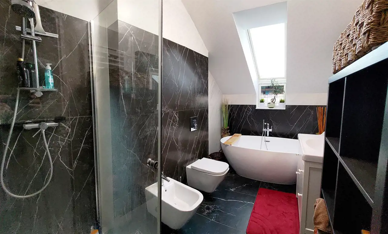 - - łazienka na piętrze z WC, z dużą kabiną prysznicową, wanną, umywalką, lustrem