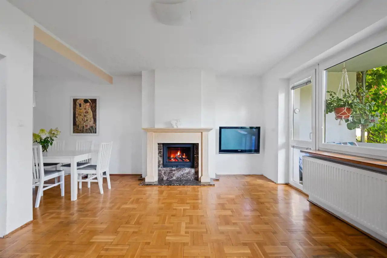 - Salon połączony z jadalnią oraz przejściem do kuchni i wyjściem na taras