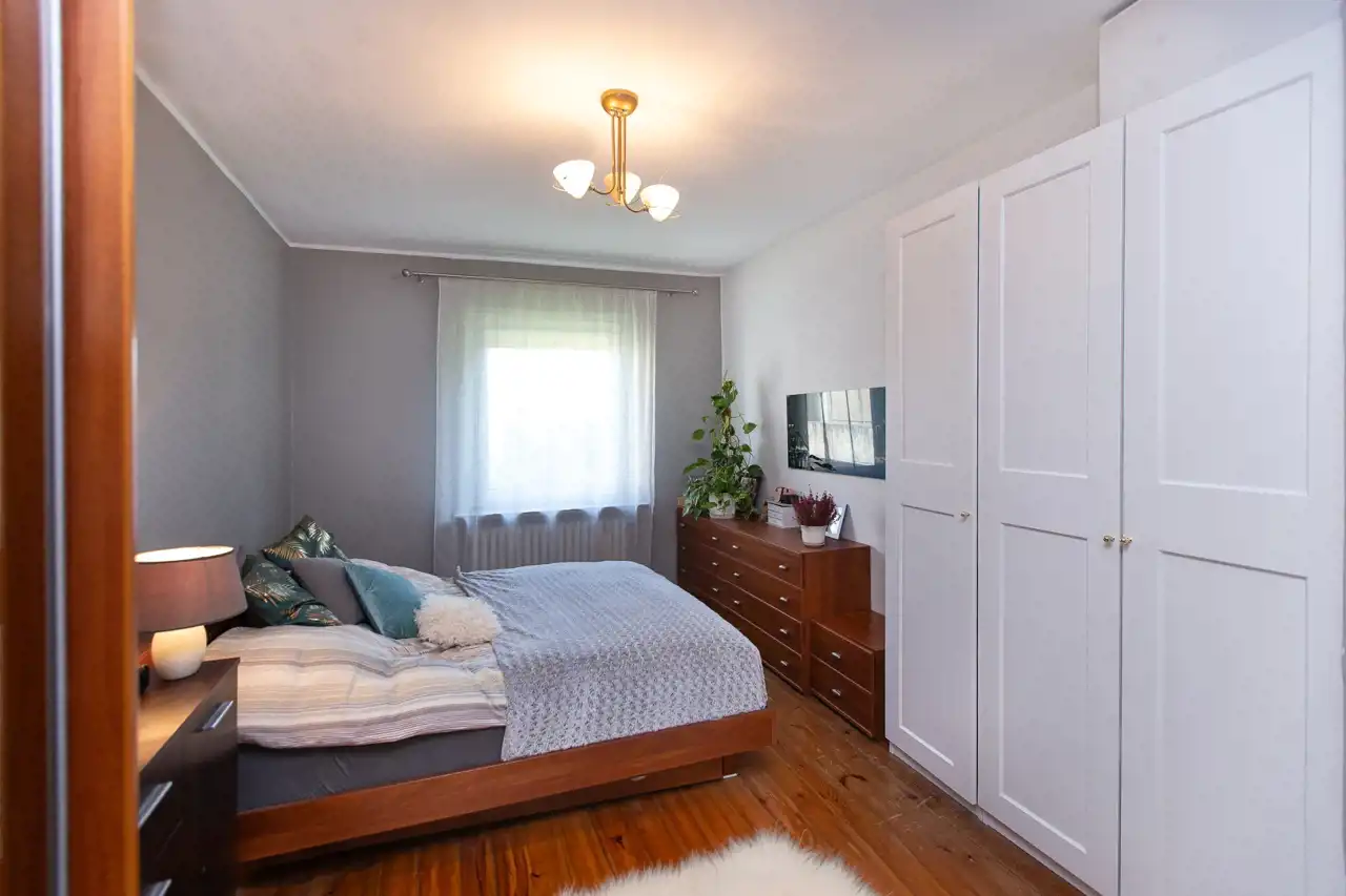 Dwa pokoje po około 21 m2, połączone oryginalnymi dwuskrzydłowymi drzwiami, (możliwe otwarcie części dziennej na parterze poprzez połączenie pokoi oraz kuchni w ponad 50 metrową przestrzeń), Kuchnia około 13 m2, Łazienka 8,5 m2, hol 8 m2, Przedsionek 4,8