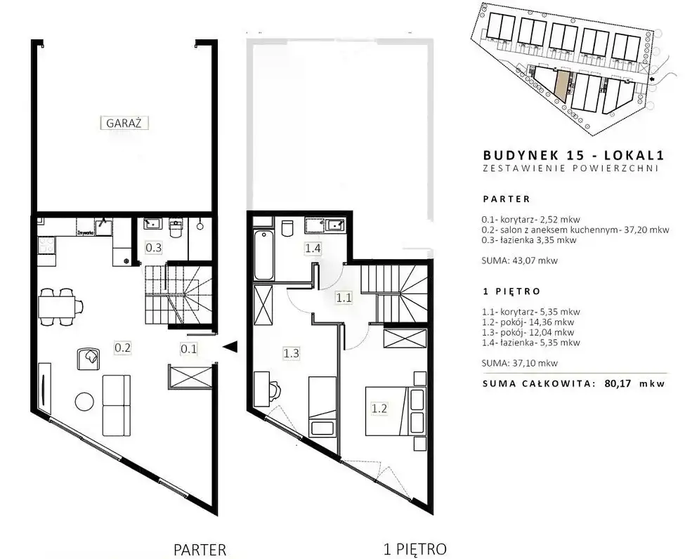 -parter: salon z aneksem kuchennym o powierzchni 37,20m.kw, łazienka z wc o powierzchni 3,35m.kw, korytarz o powierzchni 2,52m.kw oraz garaż