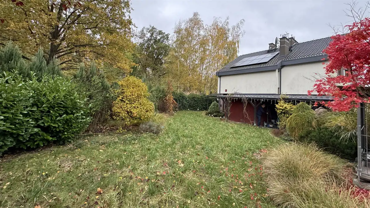 Formalnie lokal mieszkalny, a faktycznie pół bliźniaka z zagospodarowaną działka do wyłącznego używania o powierzchni 336,5 mkw. Budynek z 2014 roku, dwukondygnacyjny. Dach dwuspadowy, ceramiczny z instalacją fotowoltaiczną (korzystna, dawna umowa). Wspólny z sąsiadem wiatrołap. Własna wiata samochodowa.
