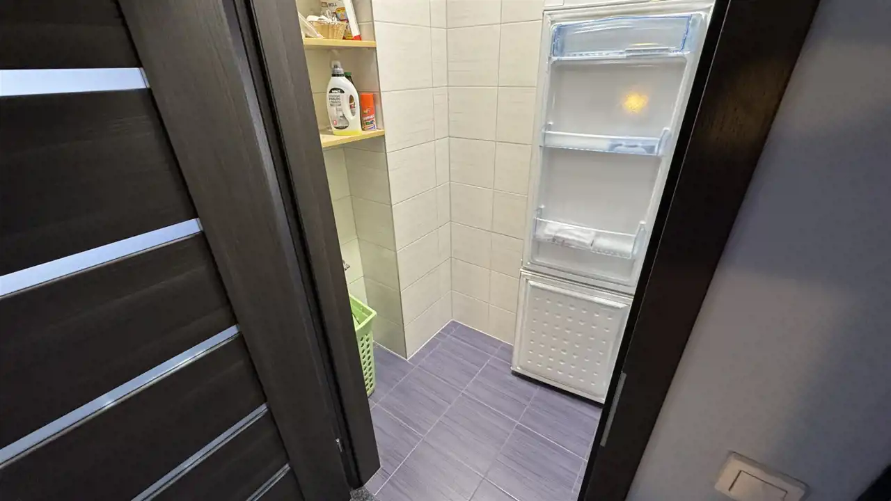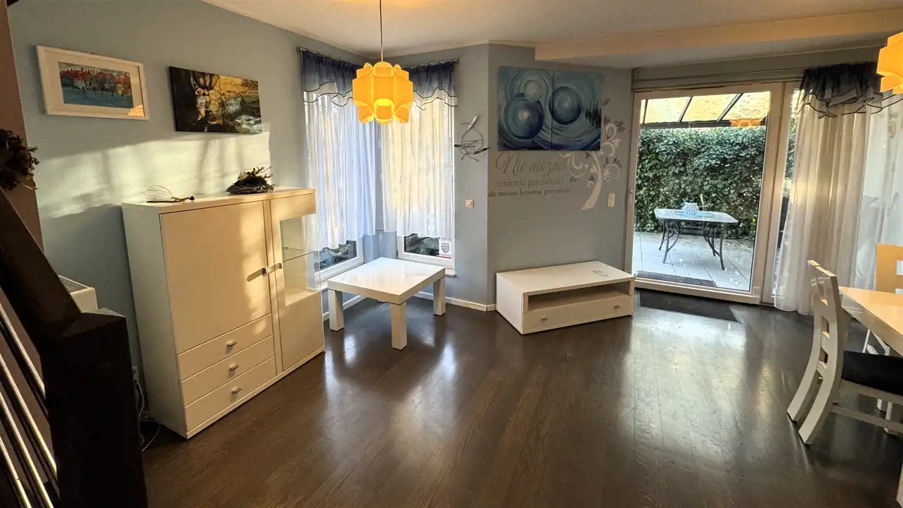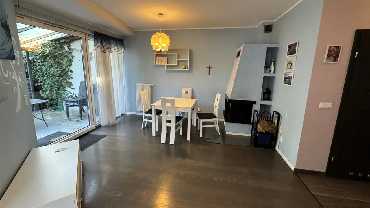 Parter: pokój dzienny z wyjściem tarasowym na ogródek, kominek. Duża kuchnia z zabudową (zmywarka, lodówka, płyta indukcyjna, piekarnik), dolne WC, przedpokój, pomieszczenie gospodarcze. W oknach rolety.