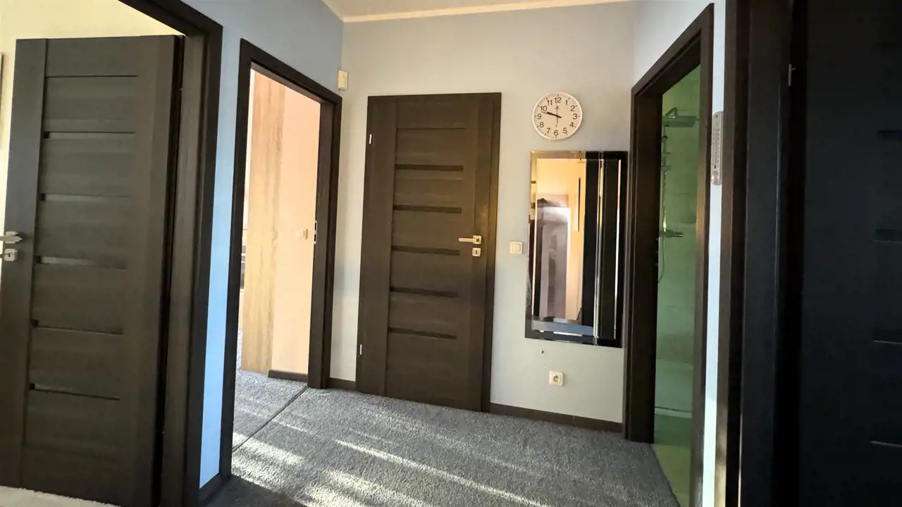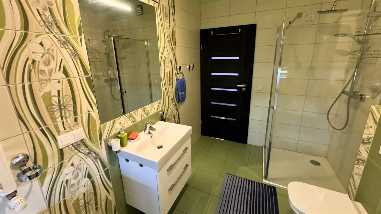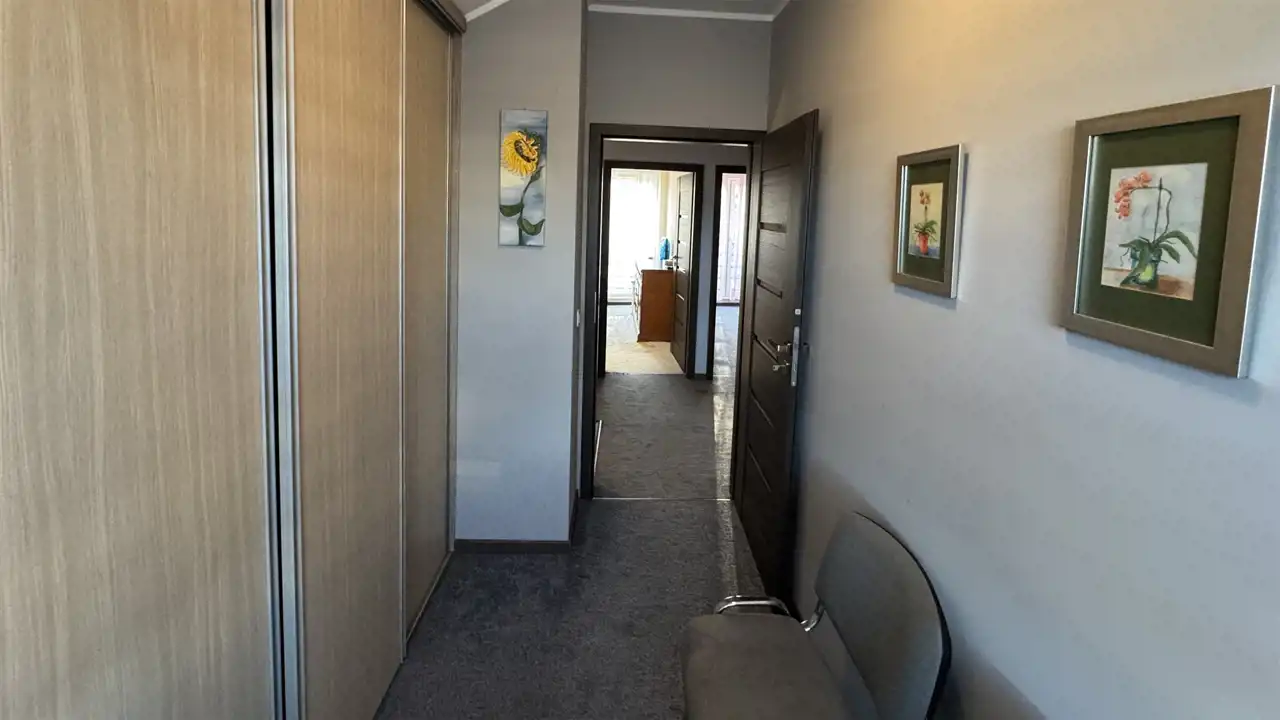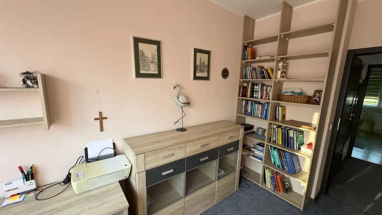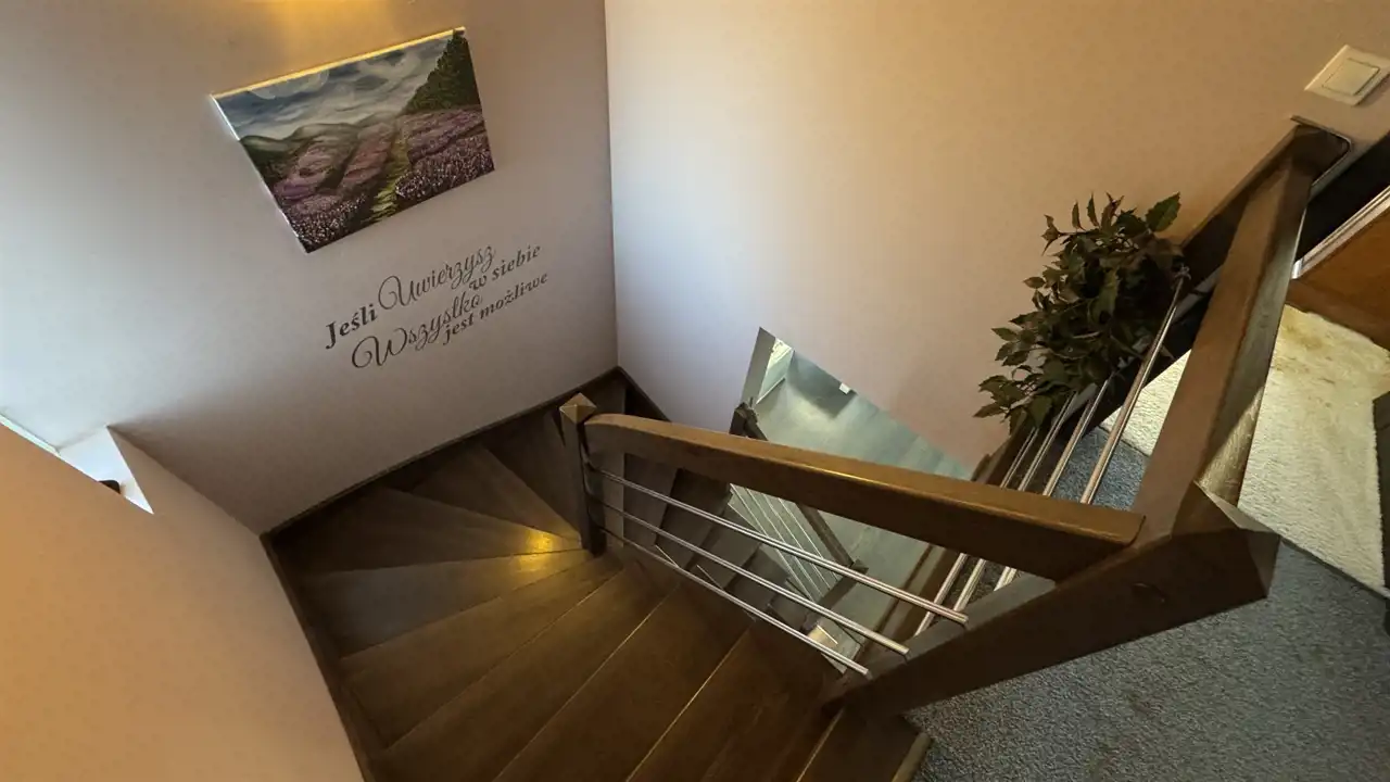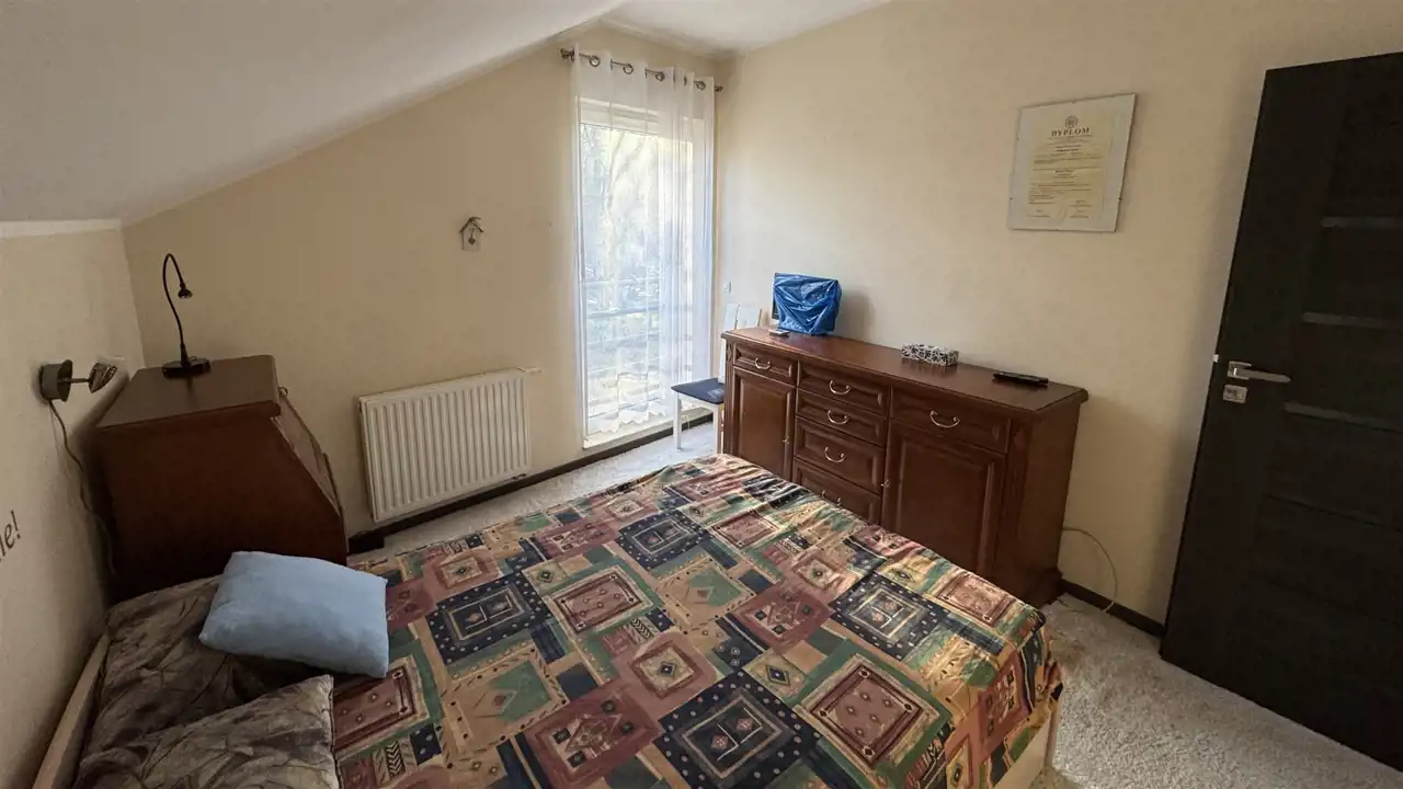 Piętro: Dwa pokoje, obszerna łazienka (samodzielny prysznic, wanna), garderoba z dużą szafą w zabudowie, pomieszczenie gospodarcze, przedpokój. Wyjście na nieużytkowe poddasze.
