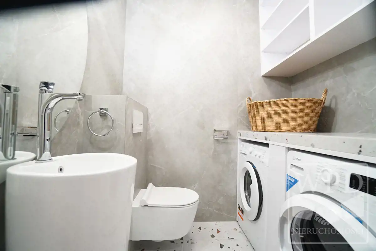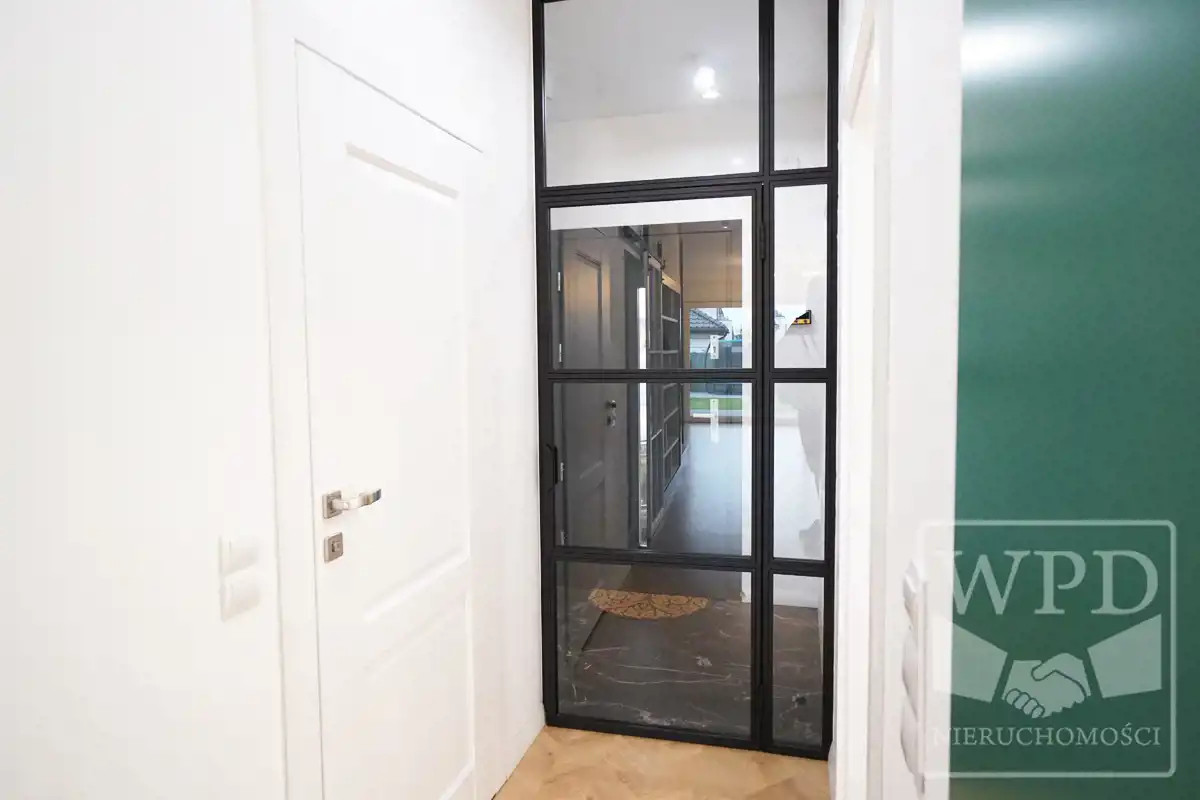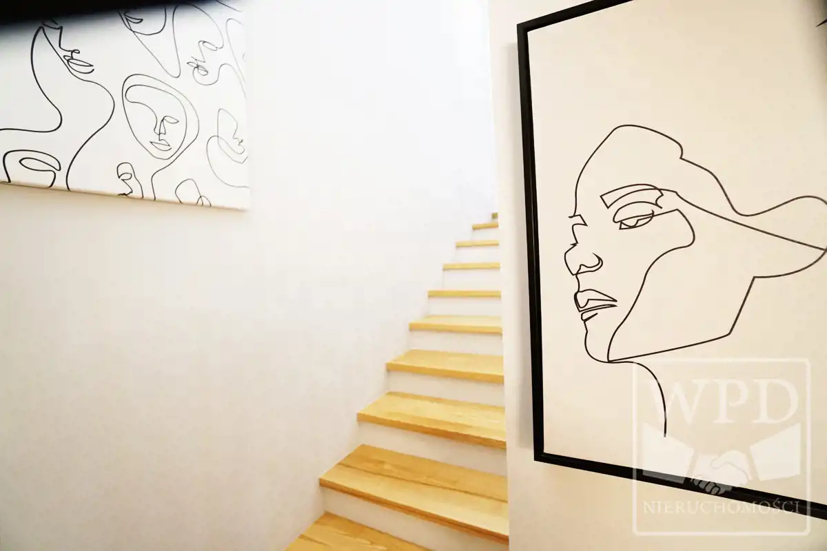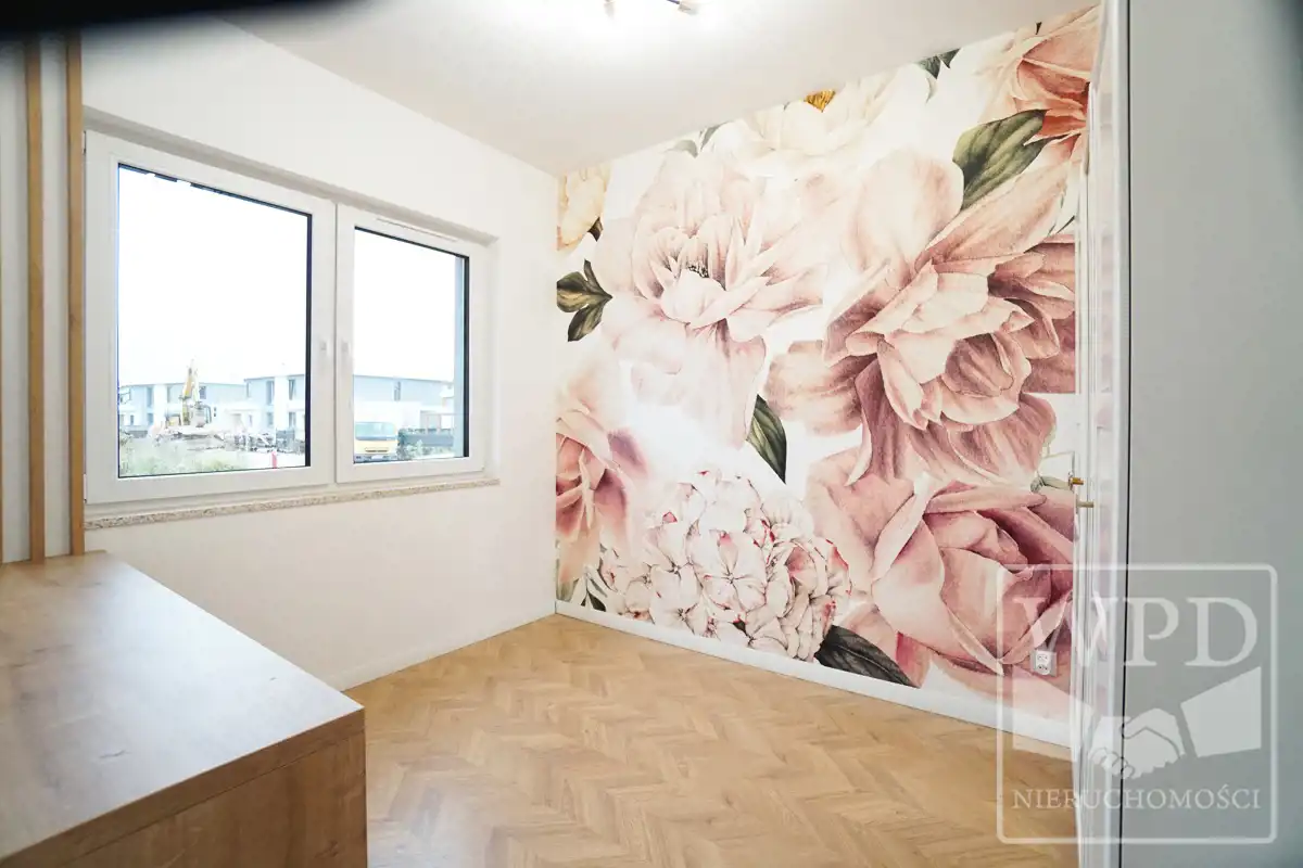 Na drugim poziomie znajdują się trzy pokoje w tym jeden z garderobą oraz łazienką, a także pralnia z WC.
