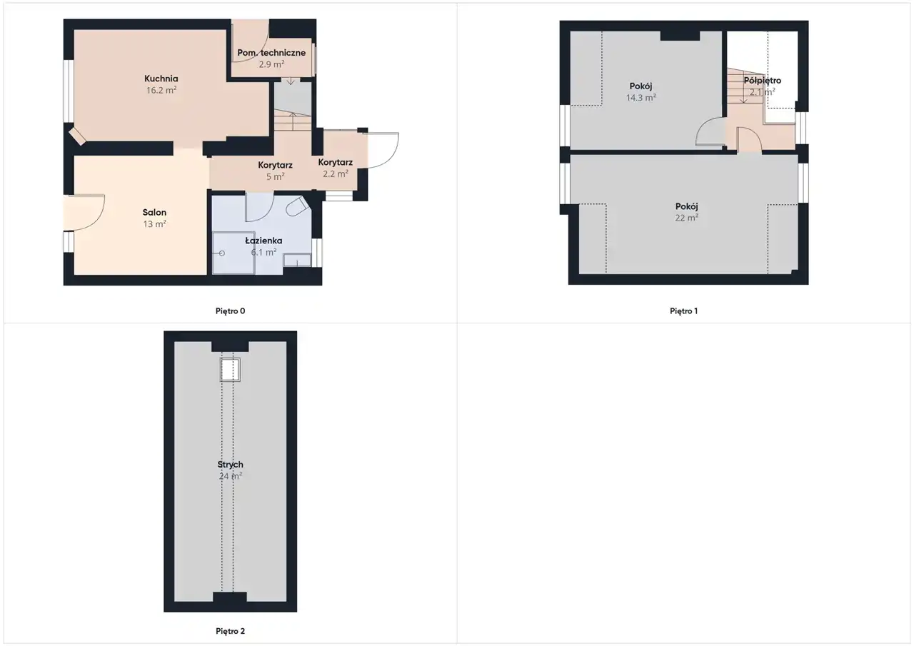 W budynku znajduje się m.in. salon, duża kuchnia, dwa pokoje, łazienka, strych i pomieszczenie techniczne.