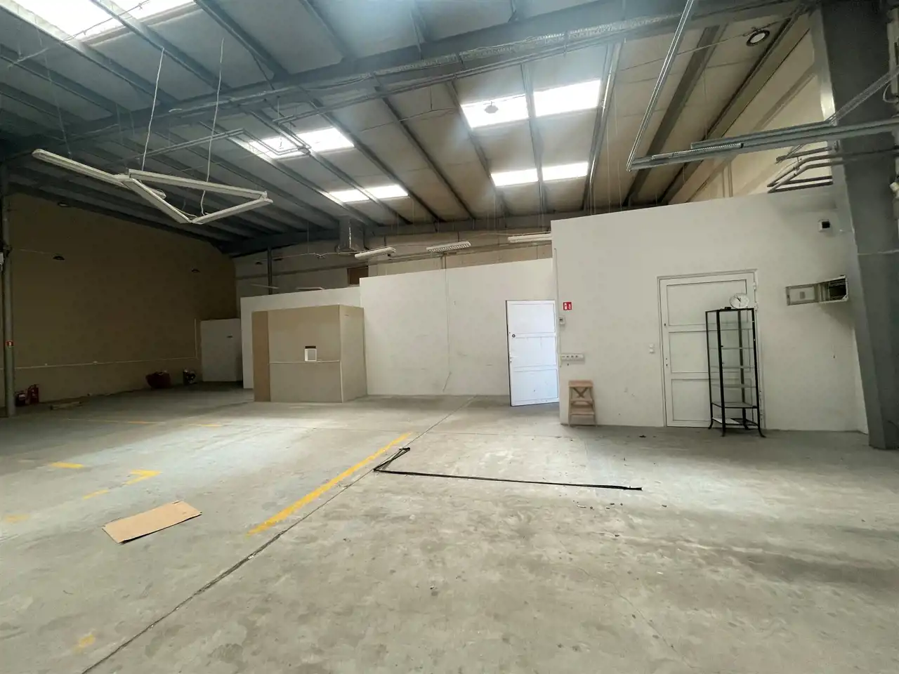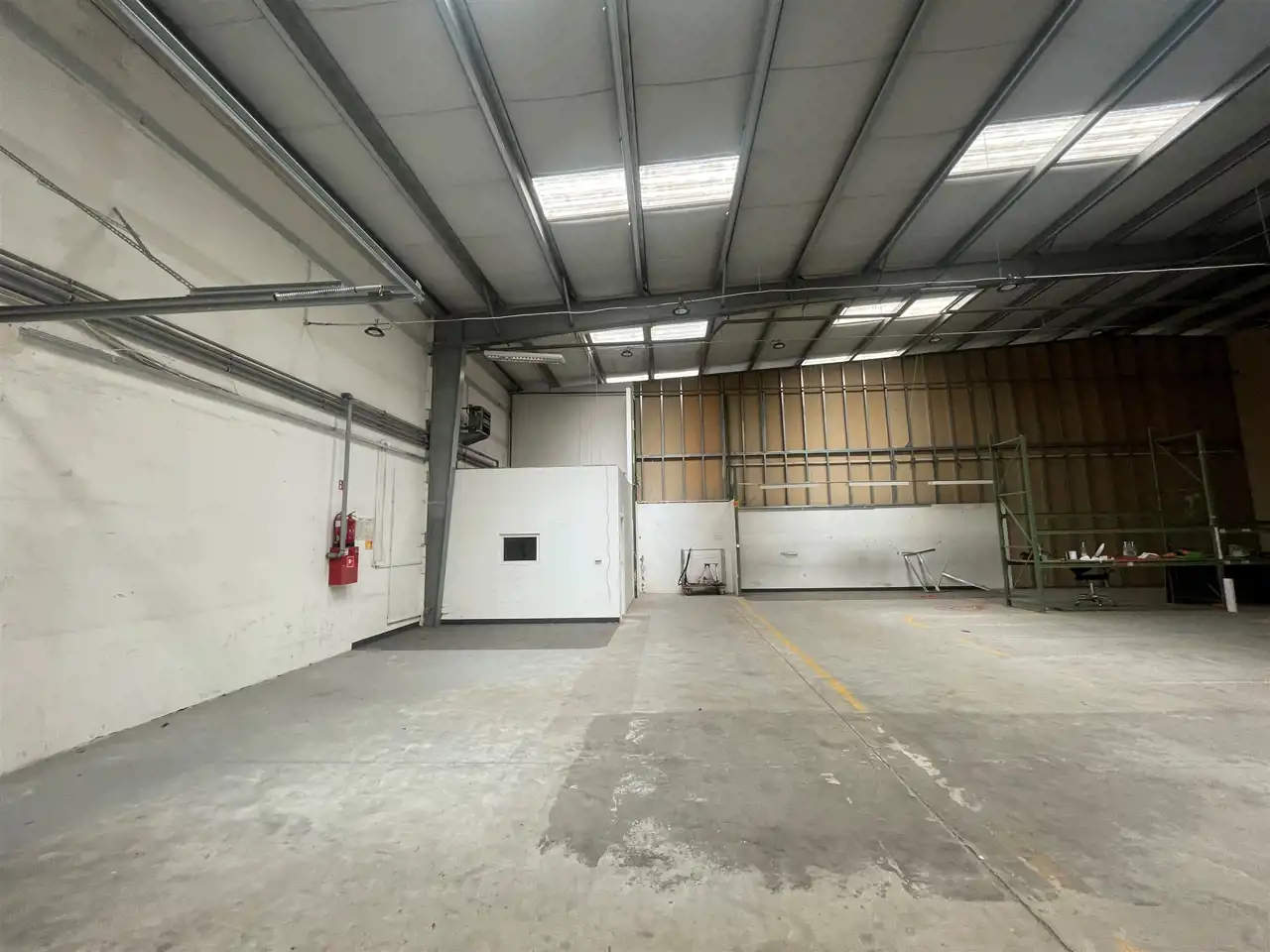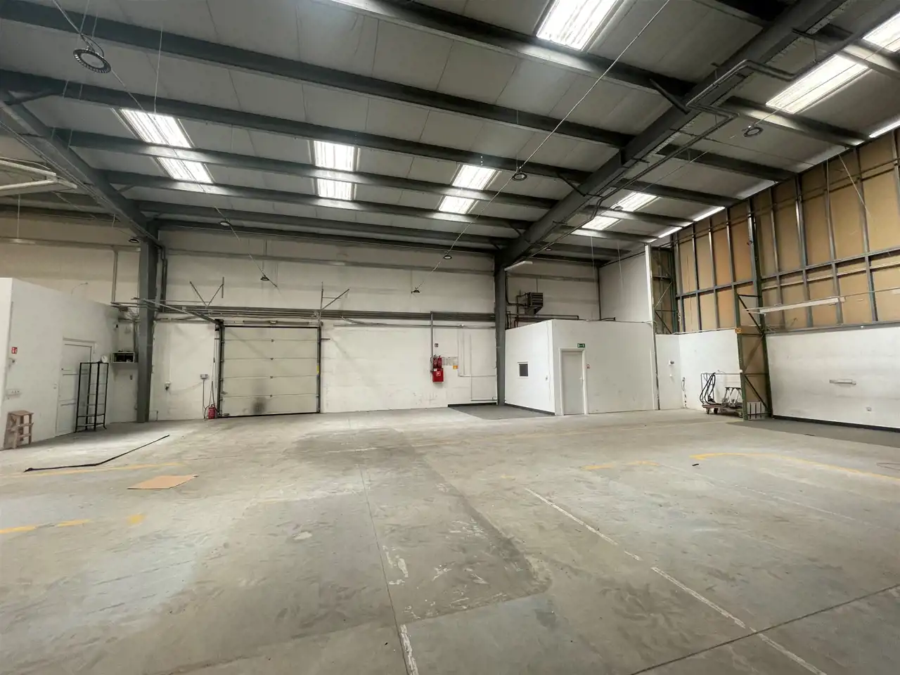 Konstrukcja hali stalowa, ściany murowane, dach kryty blachą, posadzka niepylna, świetliki, brama segmentowa szer ok. 3m wysokość 3,5 m.