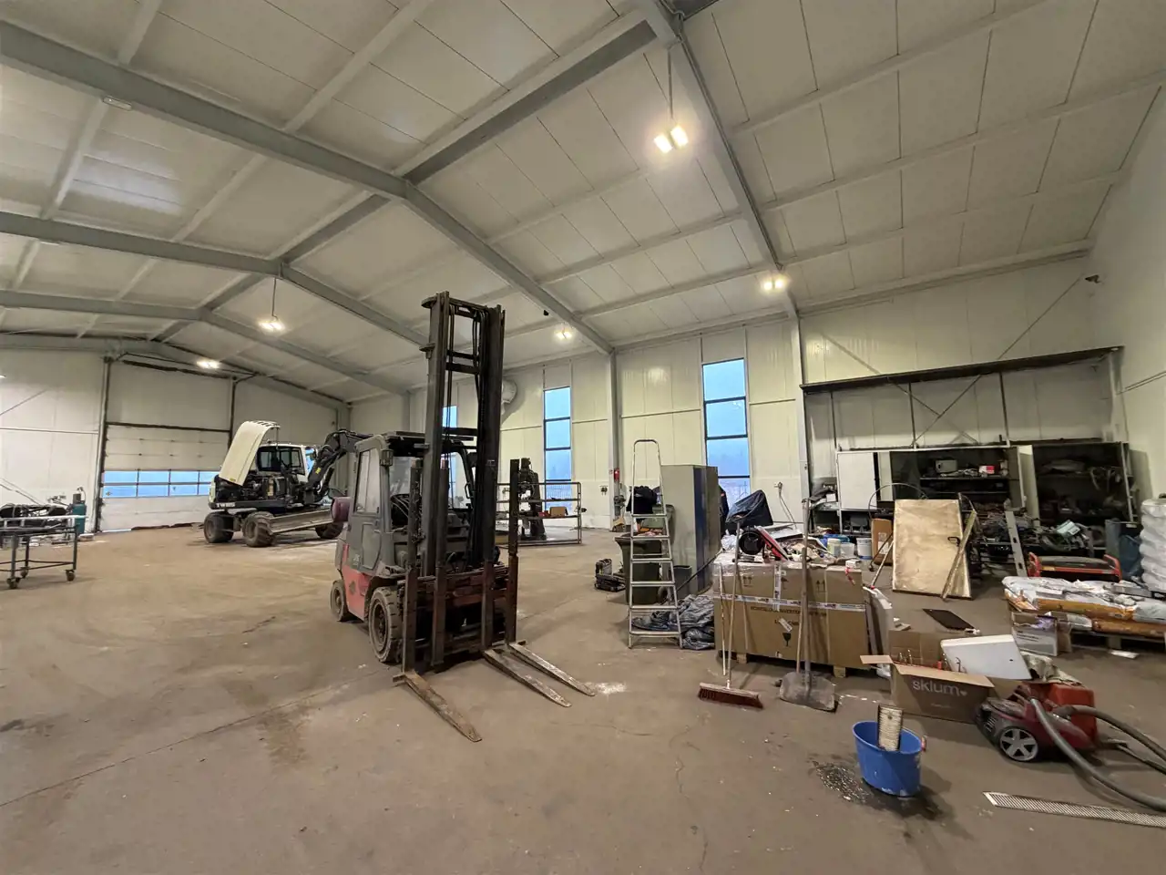 Hala o konstrukcji stalowej, jasna i czysta o powierzchni 500 mkw, na planie prostokąta 17 m x 30 m, wysokości 6 m do okapu, w szczycie 7 m,