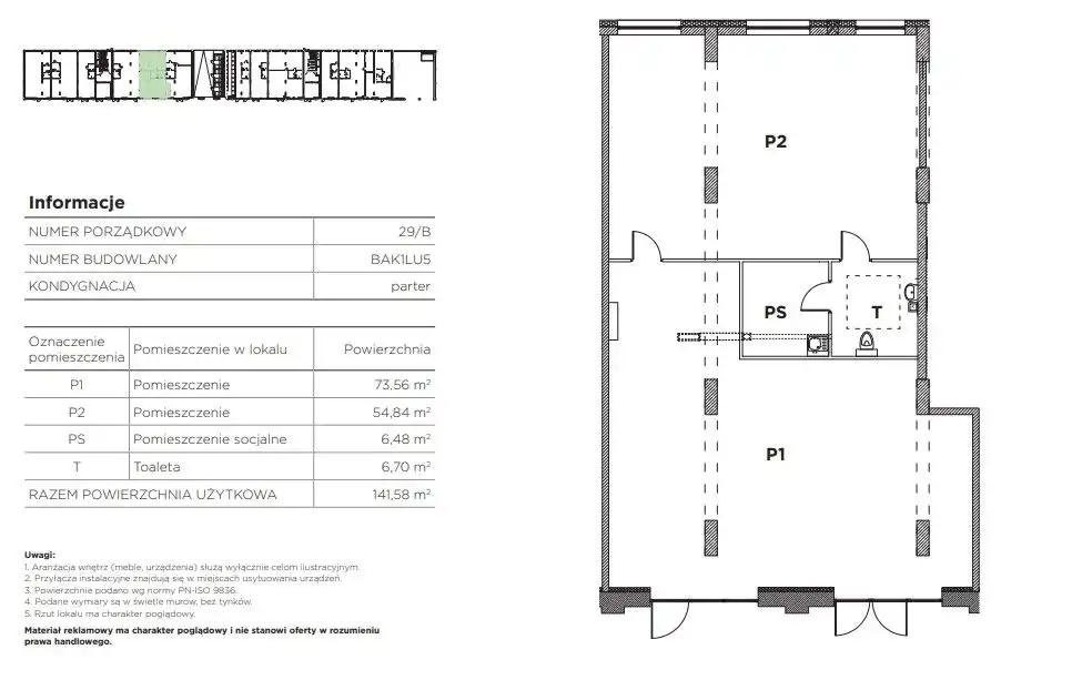 Prezentowany lokal o powierzchni użytkowej 134,91 m.kw. składa się z pomieszczenia głównego o pow. 119,97 m.kw., pokoju socjalnego o pow. 8,34 m.kw. oraz toalety o pow. 6,60 m.kw. Usytuowany jest na parterze oddanego do użytku budynku. Przeszklone witryny zapewniają możliwość umieszczenia reklamy. Garaż podziemne.