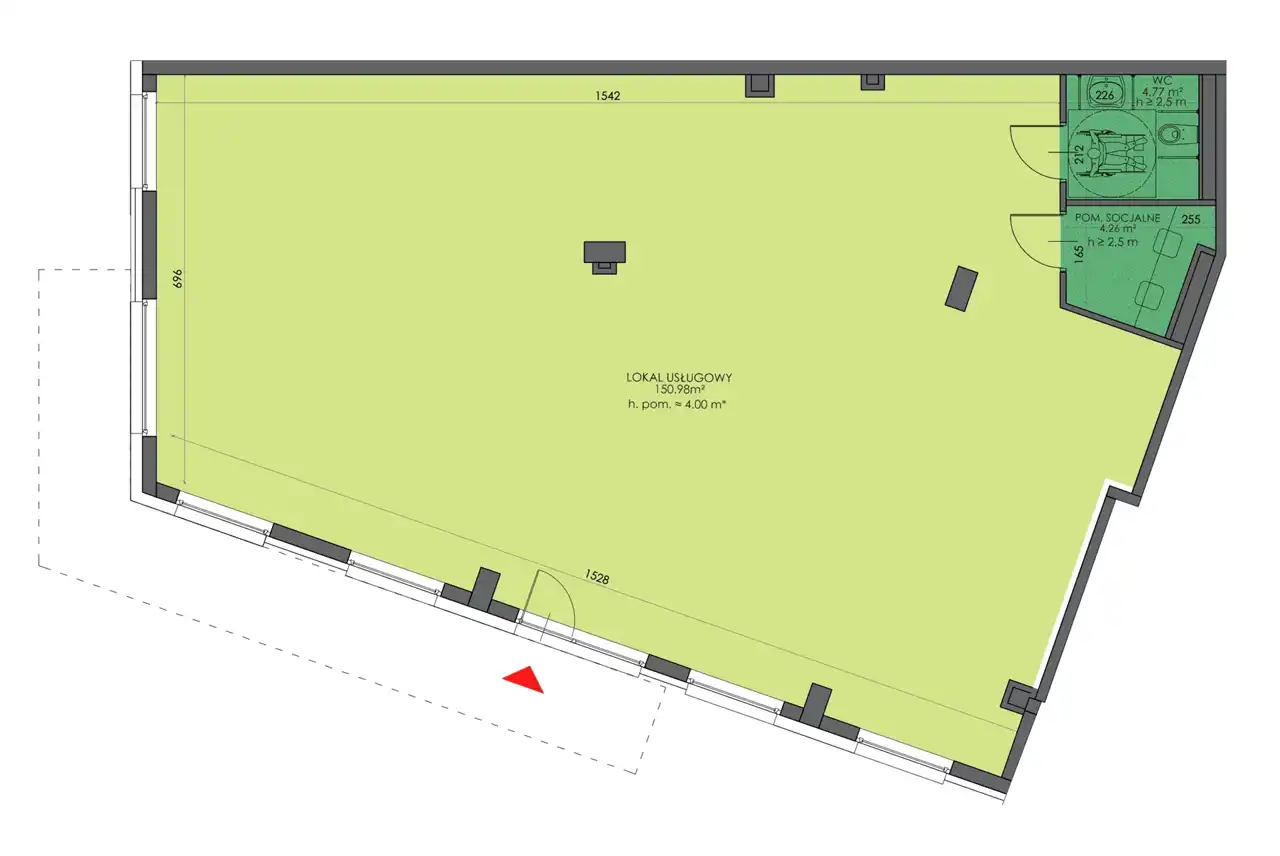- Przestronność – lokal o otwartym układzie, który łatwo zaadaptować na różne potrzeby biznesowe.