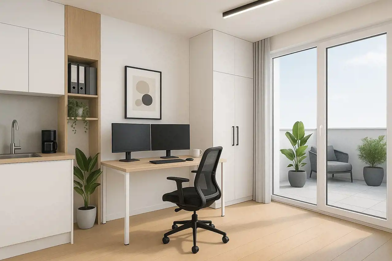 - Układ: pomieszczenie biurowe + toaleta + przedsionek