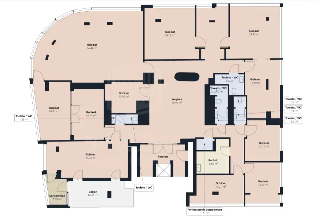 - Przemyślany Układ: 11 biur, przestronna sala konferencyjna, reprezentacyjna recepcja, serwerownia, pomieszczenia socjalne/techniczne oraz pełne zaplecze sanitarne.