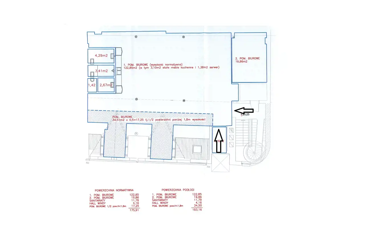 Do wynajęcia przestrzeń biurowa (całe piętro) o powierzchni 175,91 m2 (powierzchnia całkowita 193,16 M2). Wysokość pomieszczenia 3 m.
