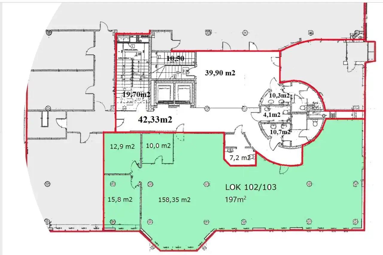 - 197m2 z wydzielonymi trzema salkami o powierzchniach 16, 13 i 10 m2, reszta jako open space z możliwością dalszego podziału.