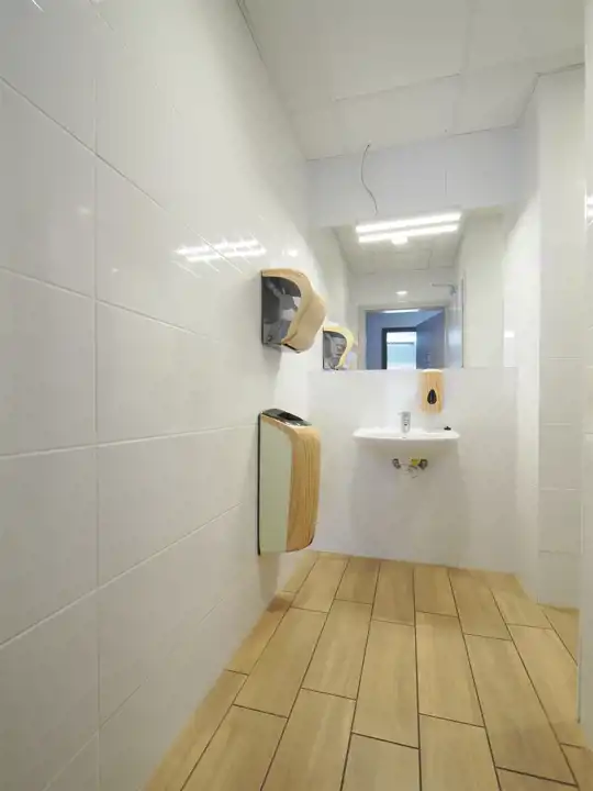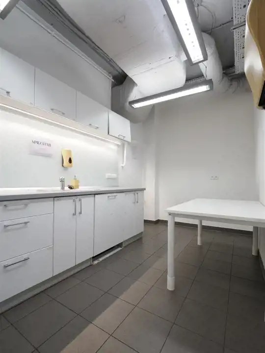 Hol, open space, salki konferencyjne, antresola, kuchnia, łazienka kabiną prysznicową, toalety.