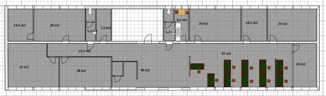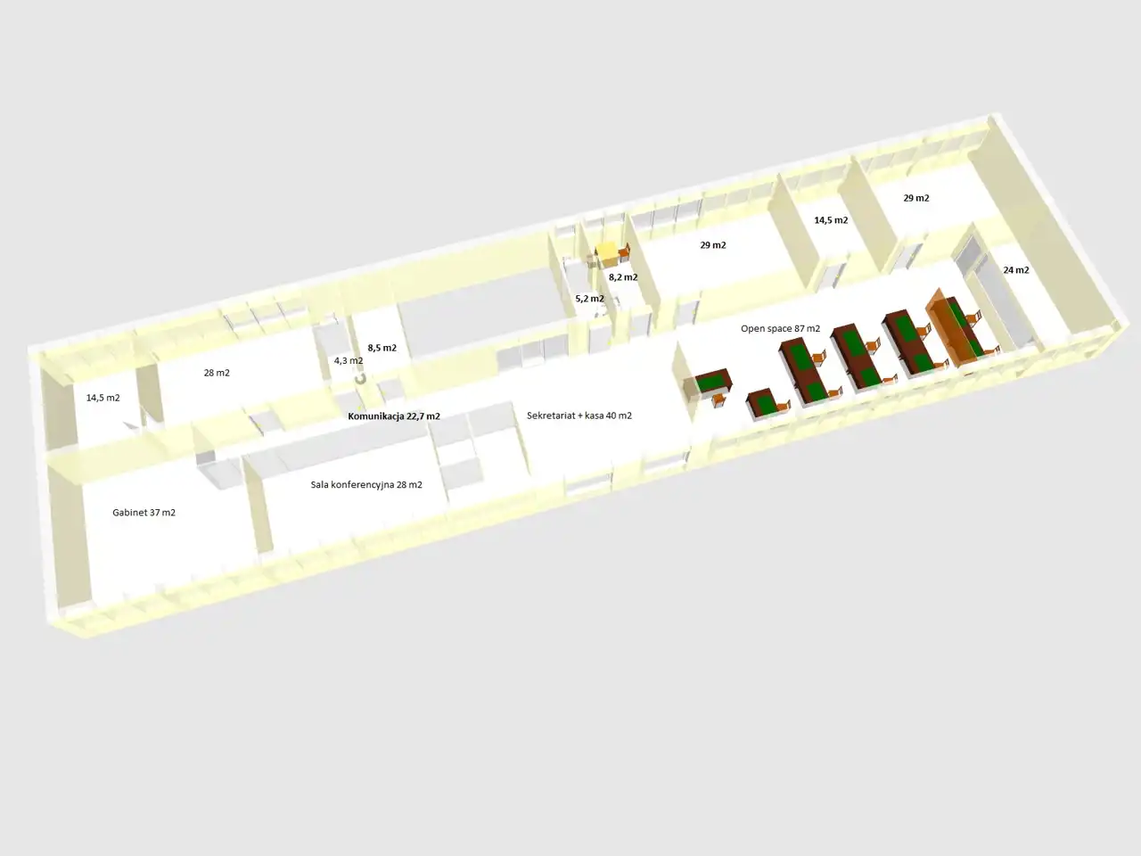 87m2, 40m2, 37m2, 29m2, 29m2, 28m2, 28m2, 24m2, 14,5m2, 14,5m2, 8,5m2, korytarz wewnętrzny – 22,7m2, pokój socjalny – 8,2m2, dwie toalety – po 5,3m2