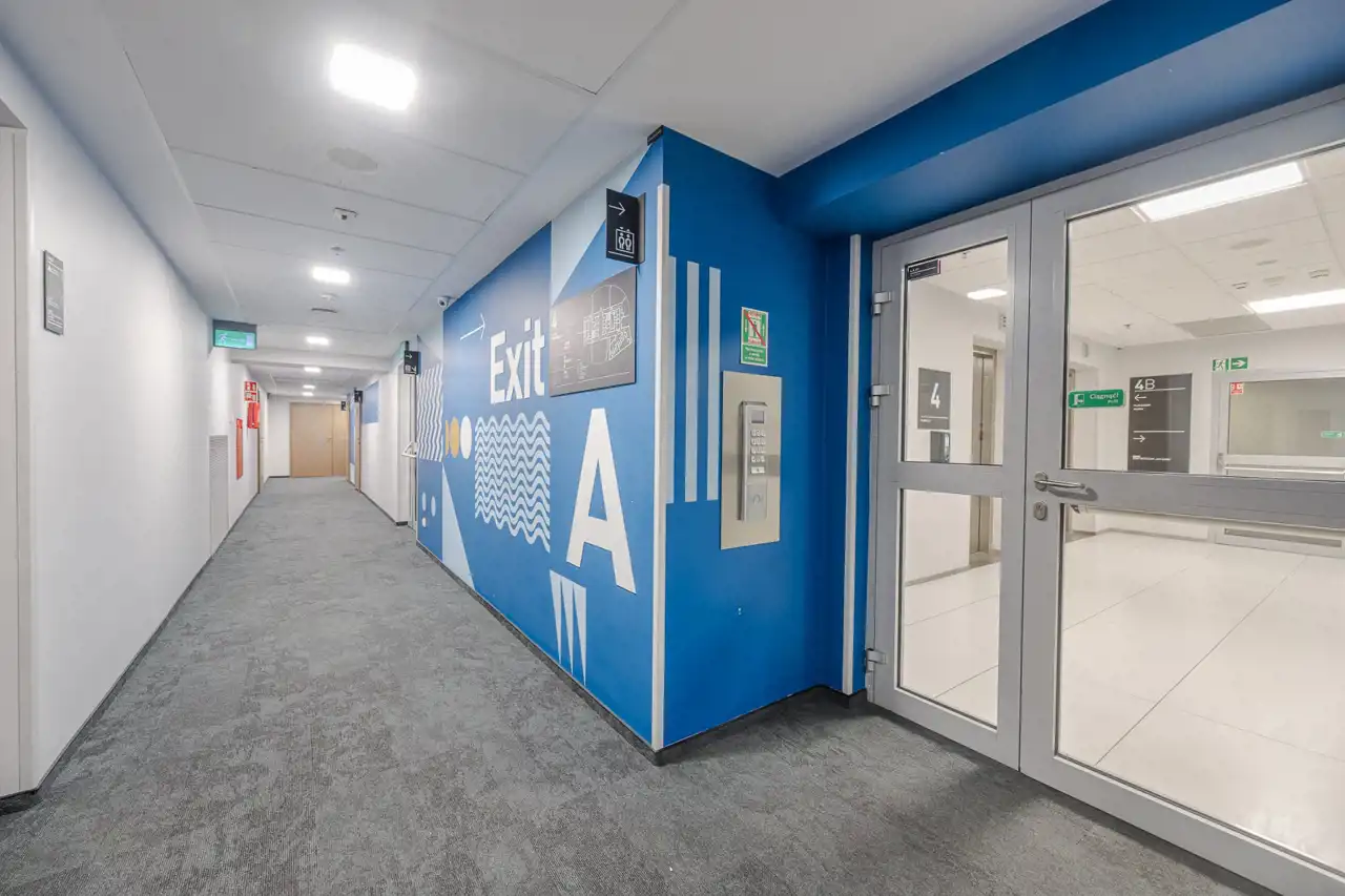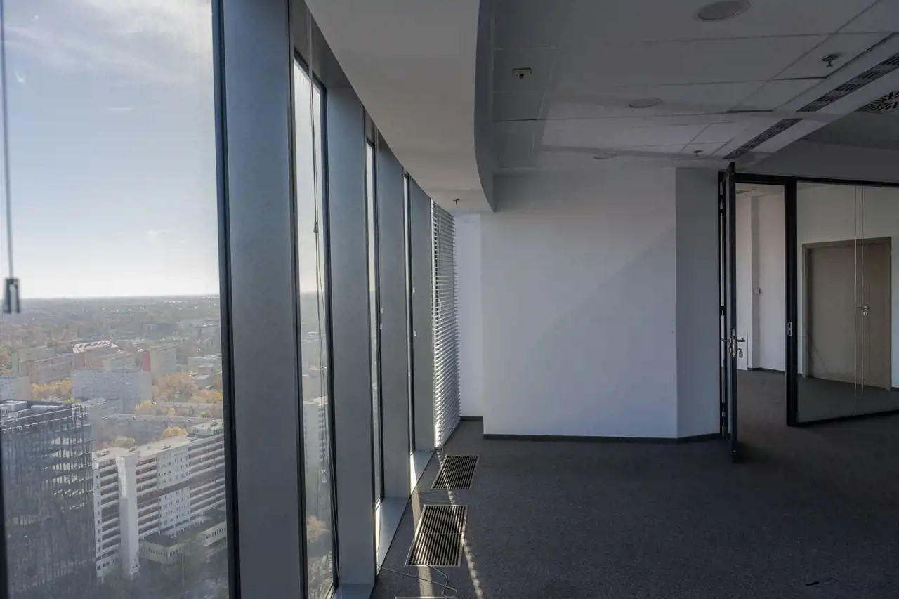 Dzięki dużym przeszkleniom wnętrza są jasne i pełne naturalnego światła, co sprzyja efektywnej i komfortowej pracy. Z okien rozpościera się imponujący widok na panoramę Wrocławia, podkreślający prestiż i wyjątkowy charakter tego miejsca.