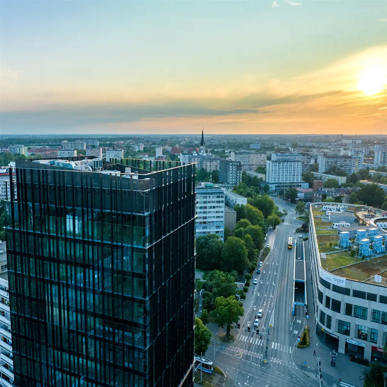 Dwie jezdnie ul. Powstańców Śląskich gwarantują sprawny dojazd samochodem, a rozbudowana sieć komunikacji miejskiej (tramwaje, autobusy) zapewnia wygodne przemieszczanie się bez konieczności korzystania z auta. Rowerzyści i piesi mogą korzystać z pobliskich ścieżek rowerowych oraz szerokich chodników, co dodatkowo podnosi atrakcyjność lokalizacji dla pracowników i klientów.