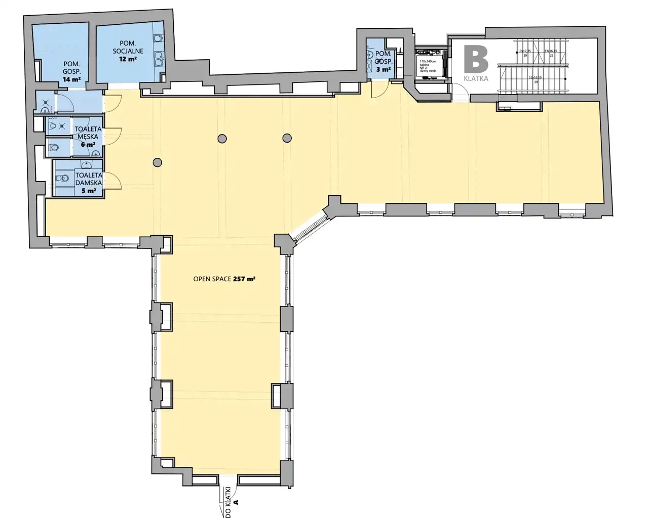Lokal składa się z powierzchni typu open space, indywidualnych toalet, pomieszczeń gospodarczych oraz pomieszczenia socjalnego.