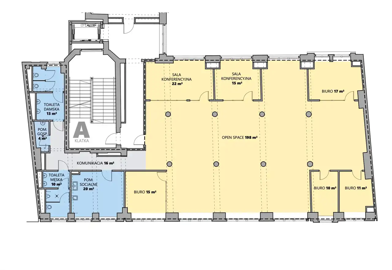 Lokal składa się z otwartej przestrzeni biurowej typu open space o powierzchni 198 m², wydzielonych pomieszczeń biurowych, sali konferencyjnych, przestronnych toalet oraz strefy socjalnej, co zapewnia komfort i funkcjonalność w codziennej pracy. Doskonała aranżacja przestrzeni pozwala na elastyczne dostosowanie powierzchni do potrzeb Twojego biznesu.