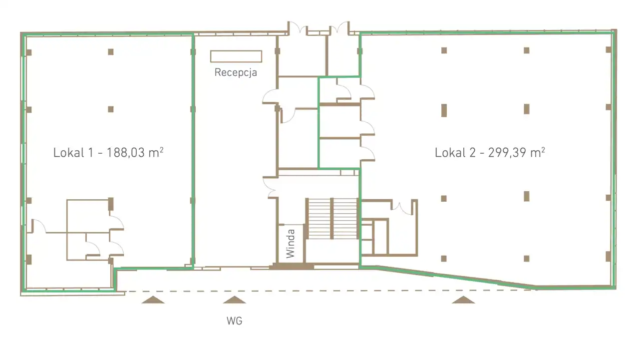 Na parterze znajdują się 2 lokale usługowe o powierzchniach 188,03 m2 oraz 299,39 m2, natomiast na 1 i 2 piętrze dostępne są duże przestrzenie "Open space" o powierzchniach 624,89 m2 oraz 623,89 m2. Te przestrzenie mogą być zaaranżowane zarówno jako jedna duża powierzchnia biurowa, jak i podzielone na dwa oddzielne "Open space" o średniej powierzchni około 312 m2 przeznaczone do własnej aranżacji.