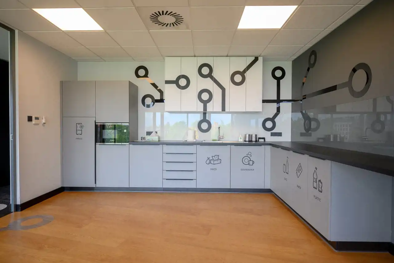 Powierzchnia składa się z dużej, przestronnej powierzchni open space oraz wydzielonych trzech osobnych pomieszczeń, które idealnie nadają się na gabinety. Dodatkowo, w obrębie biura znajduje się kuchnia, co zwiększa komfort codziennego użytkowania, serwerownia, pomieszczenie magazynowe oraz toalety.