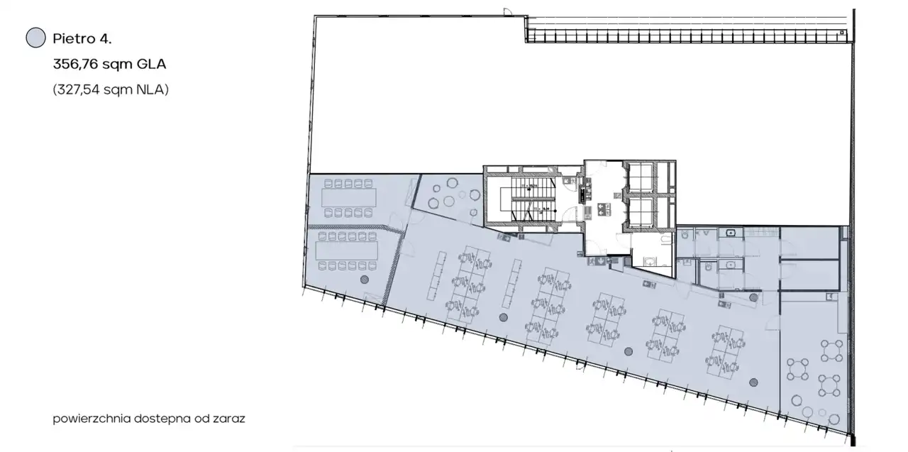 Oferujemy do wynajęcia przestronną powierzchnię biurową o łącznej powierzchni brutto 356,76 m² (netto 327,54 m²) w nowoczesnym budynku klasy A, zlokalizowanym w sercu Wrocławia. Budynek wyróżnia się nowoczesną architekturą i wysokim standardem wykończenia, zapewniając komfortowe warunki pracy.