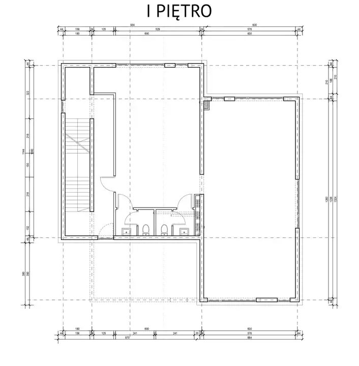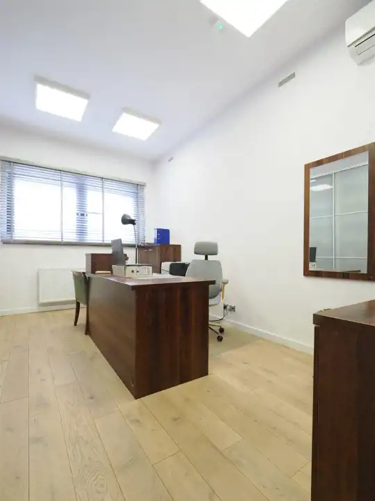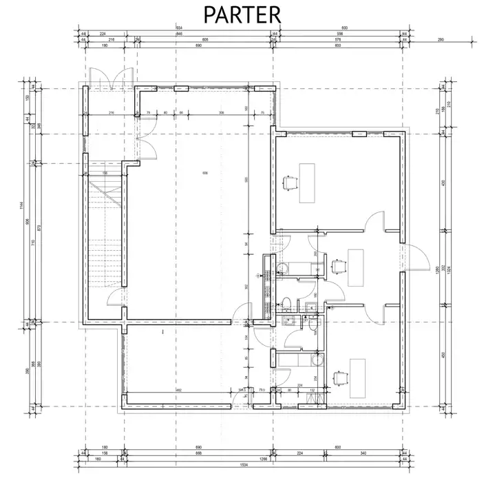 Parter- open space, sekretariat, dwa pokoje biurowe, magazyn kuchnia, dwie toalety.