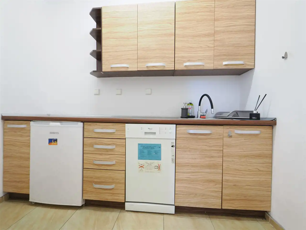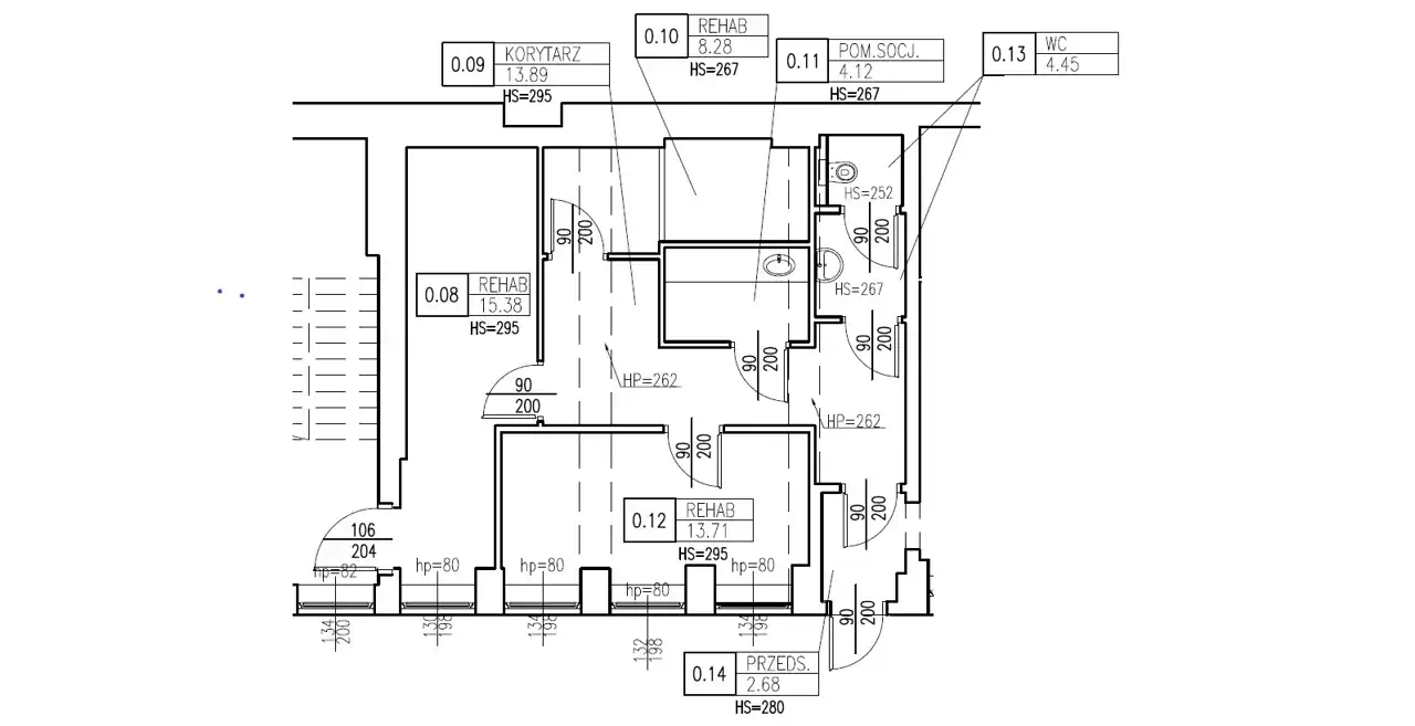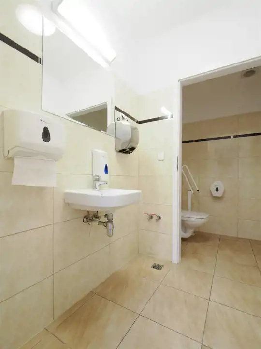 Hol, trzy niezależne pokoje z przyłączem wody, toaleta przystosowana dla niepełnosprawnych, kuchnia.