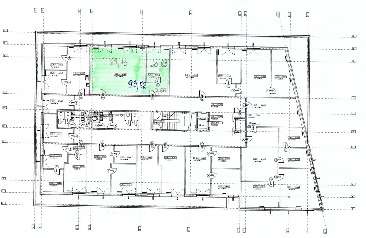 Do wynajęcia biuro o powierzchni 70 m², składające się z dwóch pomieszczeń biurowych. Toalety oraz kuchnia znajdują się w częściach wspólnych budynku. Współczynnik części wspólnych wynosi 15%.
