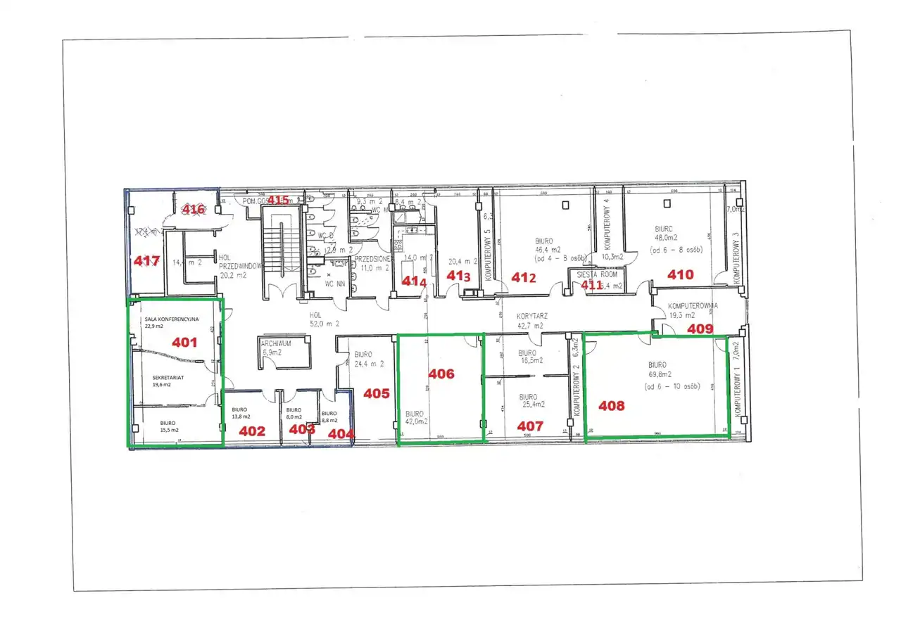 Trzy pokoje biurowe połączone drzwiami wewnętrznymi.