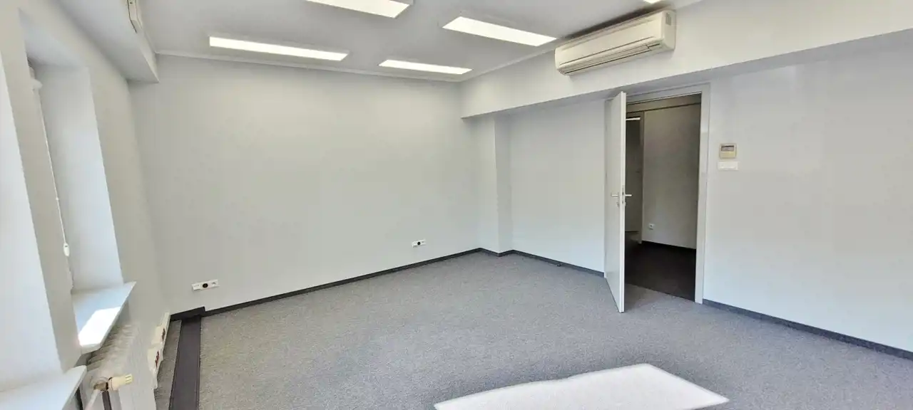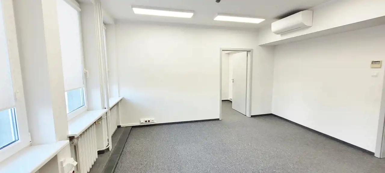 Układ: 3 pokoje ( 2pokoje po 15 m2 + 19 m2 z miejscem na sekretariat) + wspólny aneks kuchenny i WC