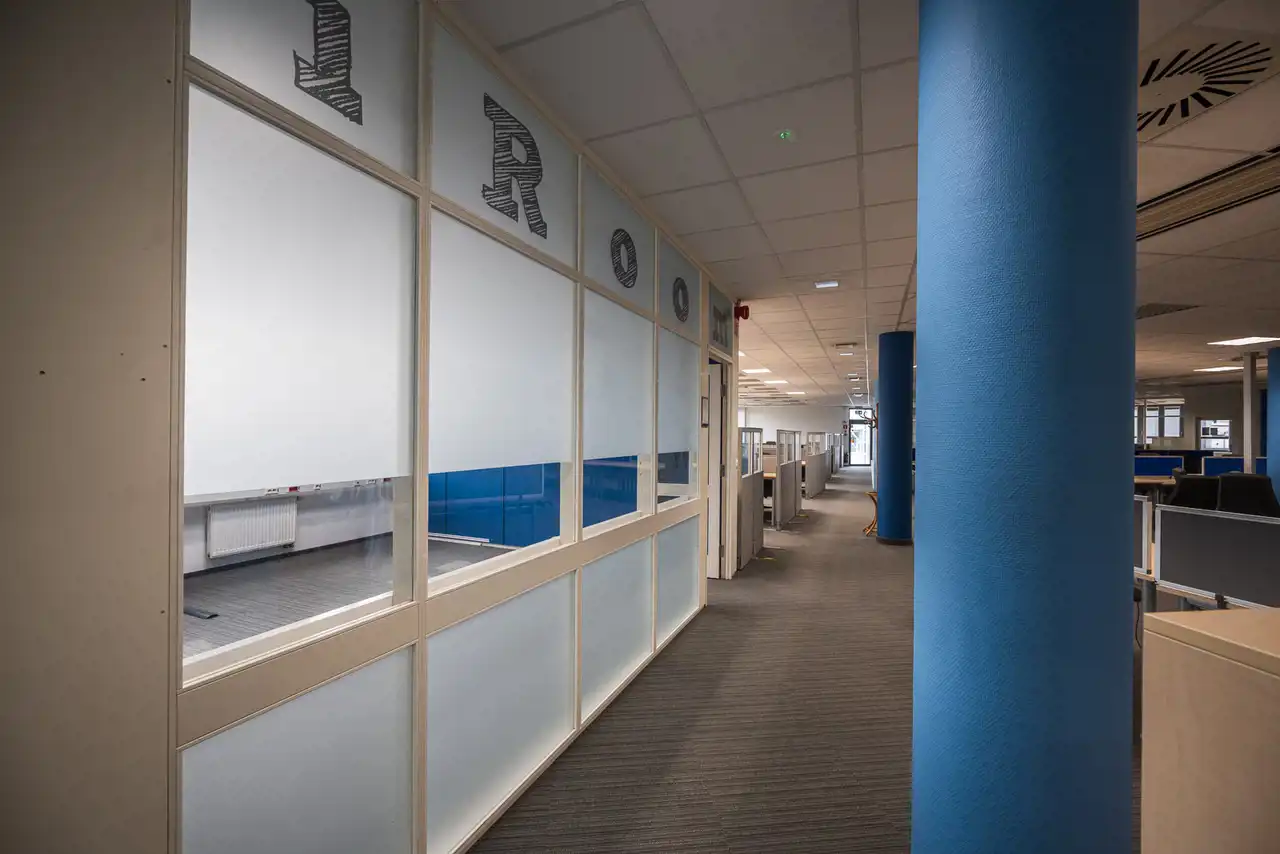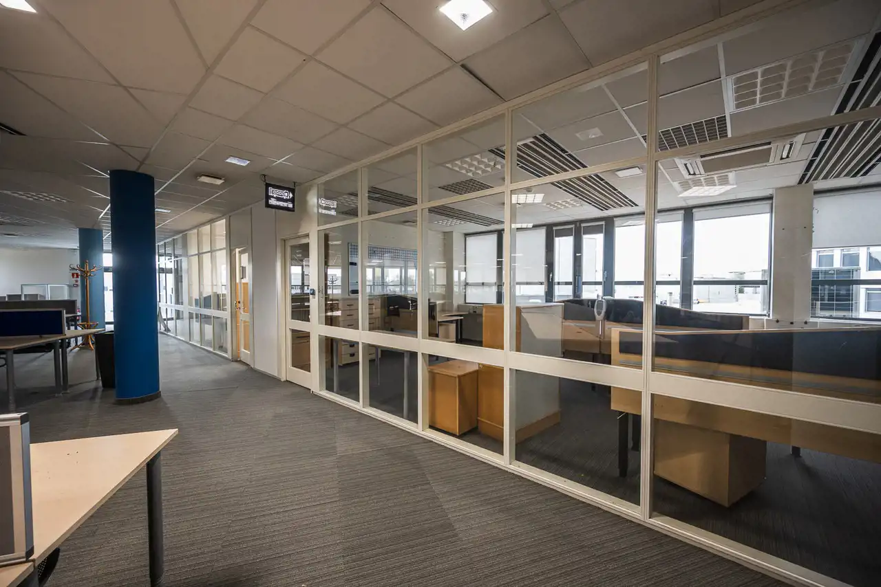 - Wykończenie wnętrza: sufity podwieszane, oświetlenie systemowe oraz wykładziny biurowe na podłogach.