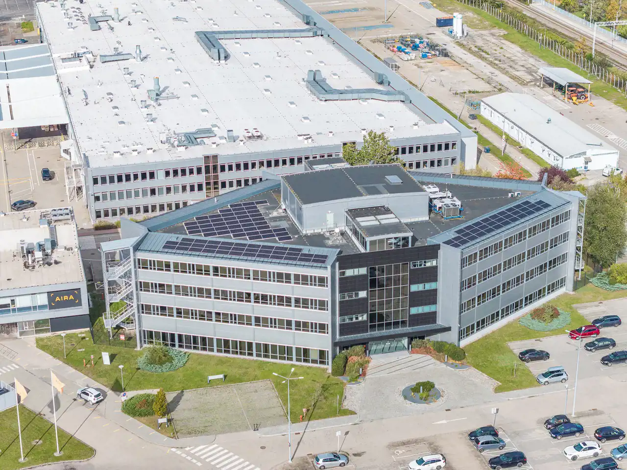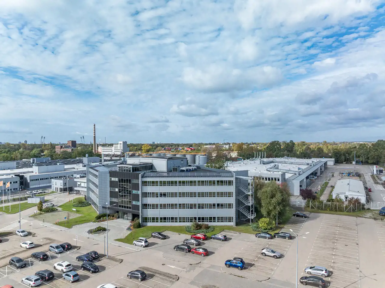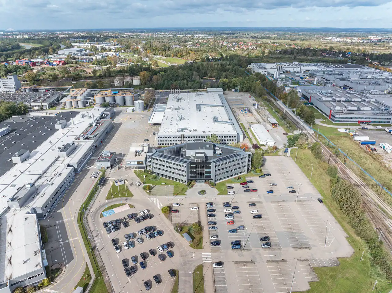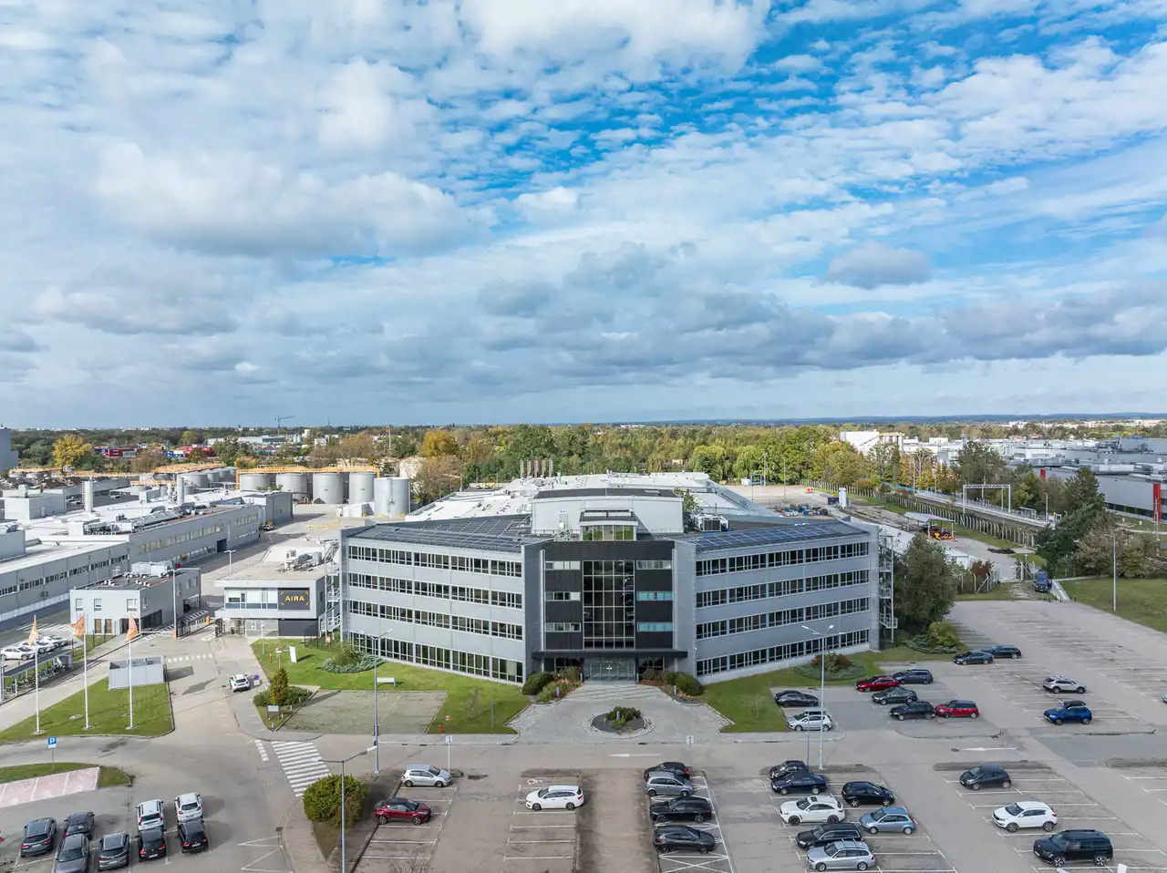 - Otoczenie prestiżowych firm, takich jak Volvo czy 3M, podkreślające biznesowy charakter lokalizacji.