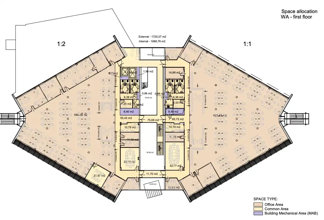- Powierzchnia: 729,39 m², zajmująca 50% jednej kondygnacji.