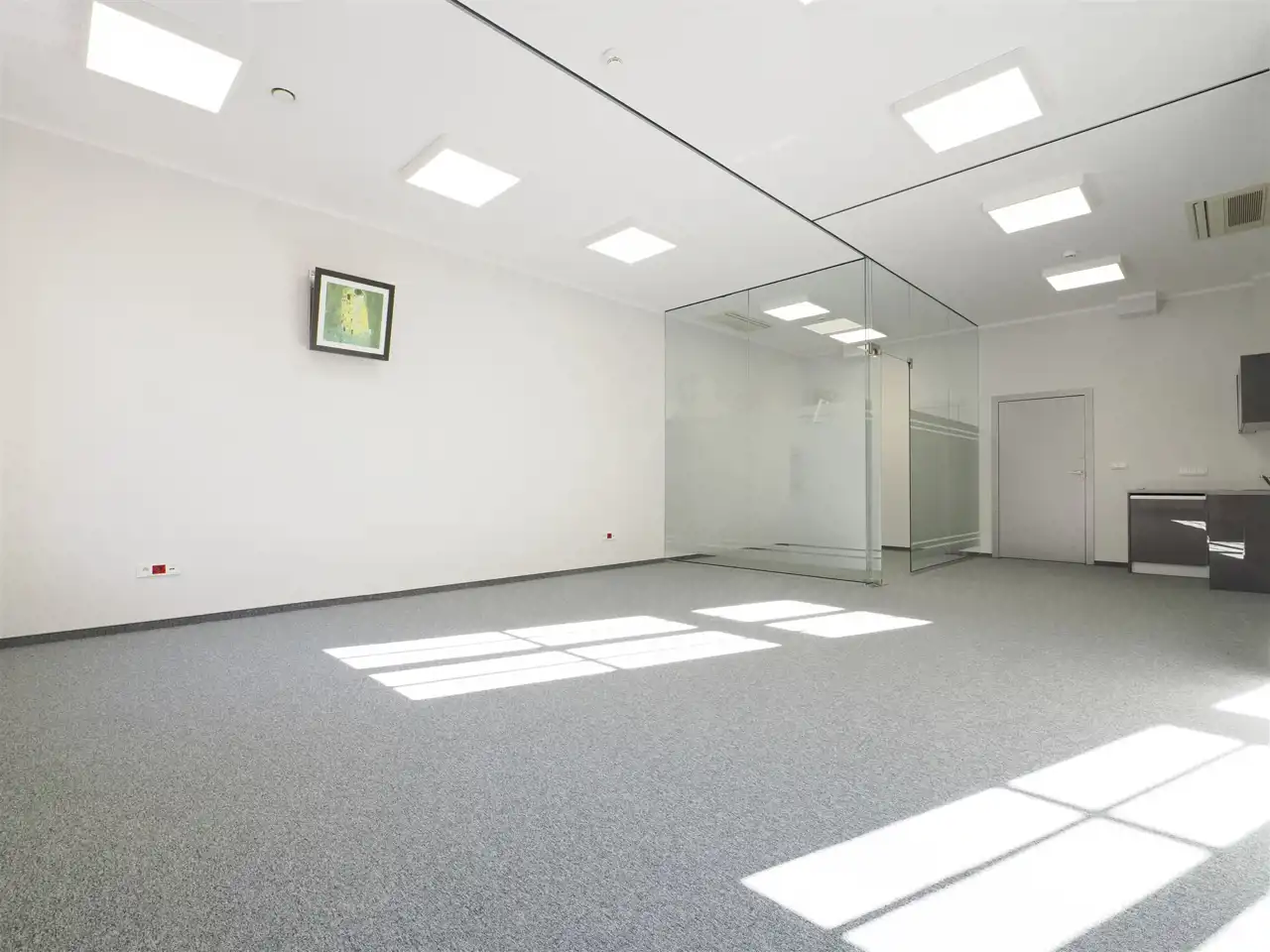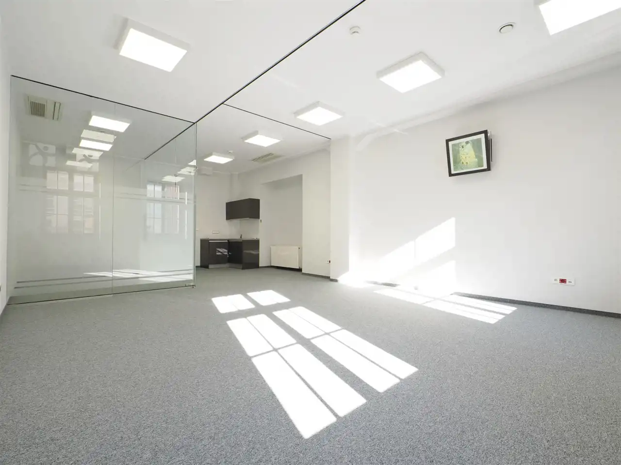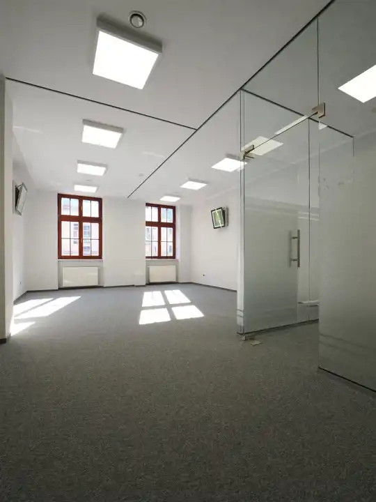 Open space podzielony przeszkleniami tworzącymi sekretariat, dwa gabinety i salkę konferencyjną.