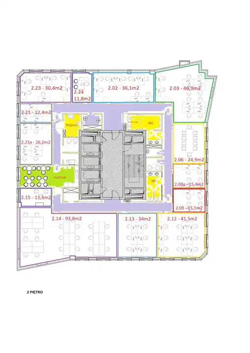 Proponowane pokoje: 30m2, 12m2, 36m2, 49m2, 24m2, 30m2, 41m2, 34m2, 53m2, 25m2, 38m2.