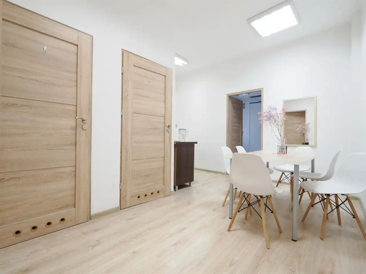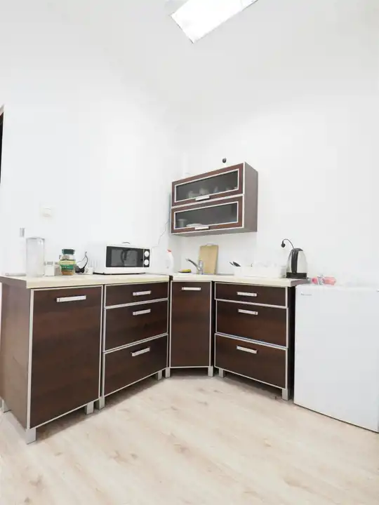 Sekretariat, hol, powierzchnia open space, ,salka konferencyjna, cztery gabinety, kuchnia, , toalety.