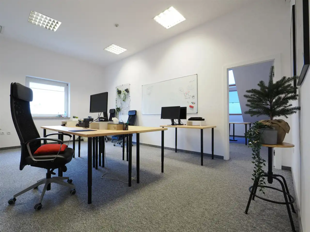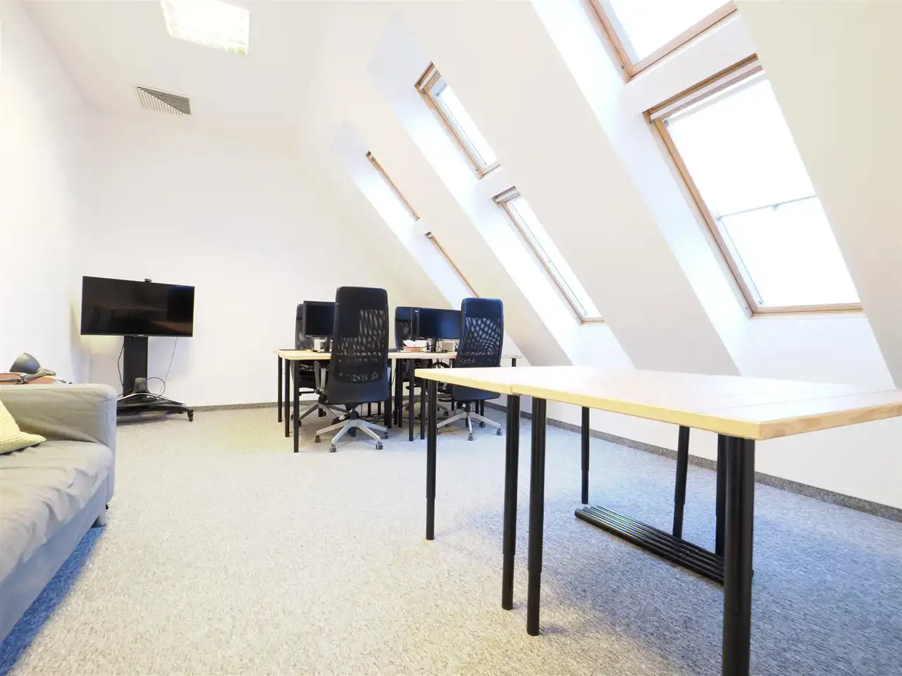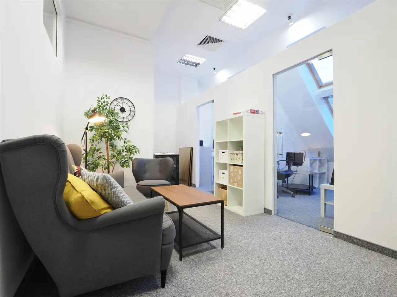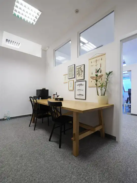 Hol, dwie powierzchnie open space, pokój, 3 salki konferencyjne, aneks kuchenny.