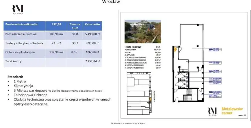 Czynsz najmu: 50 zł/m2 netto, opłata eksploatacyjna 8 zł/m2 netto + prąd, woda, ogrzewanie wg zużycia.
