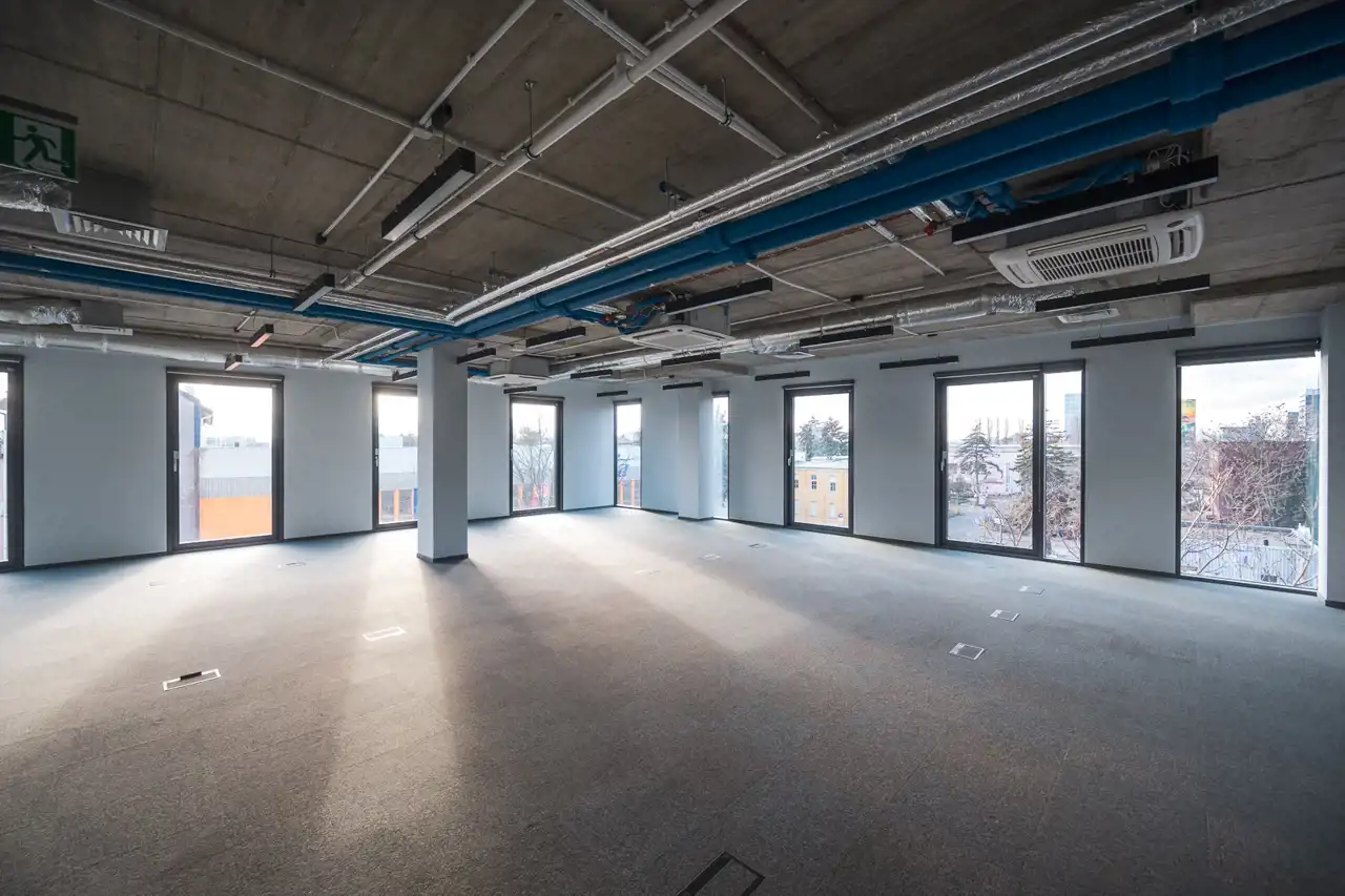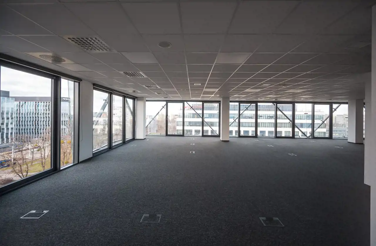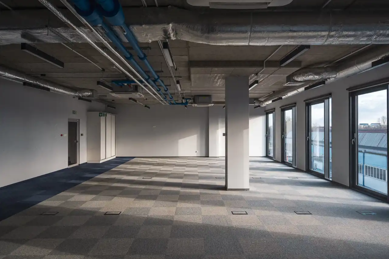 Układ przestrzeni oparty jest na otwartym planie z możliwością wydzielenia mniejszych pomieszczeń, takich jak sale konferencyjne czy gabinety. Naturalne światło, wpadające przez duże okna sięgające od podłogi do sufitu, zapewnia komfortowe warunki do pracy i podkreśla nowoczesny charakter wnętrza. Przestrzeń wykończona jest w jasnych barwach – białe ściany, podwieszany sufit z oświetleniem i wentylacją – co tworzy profesjonalną i inspirującą atmosferę. Zróżnicowane wykończenie podłóg – polerowane drewno oraz wykładziny – łączy estetykę z funkcjonalnością.