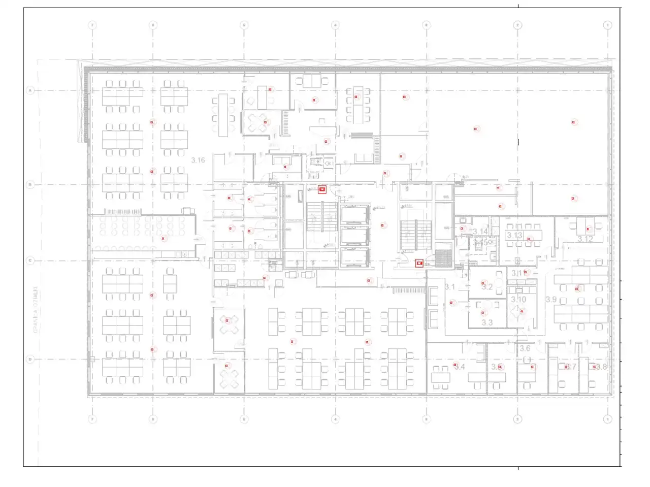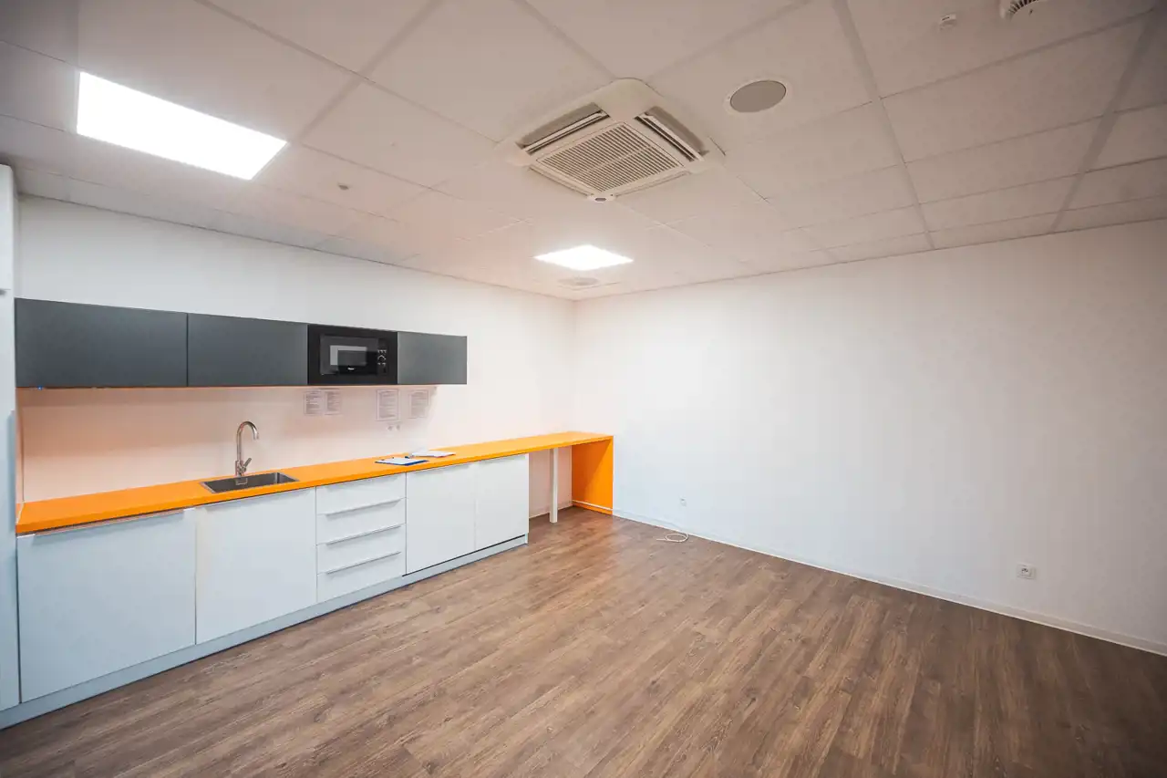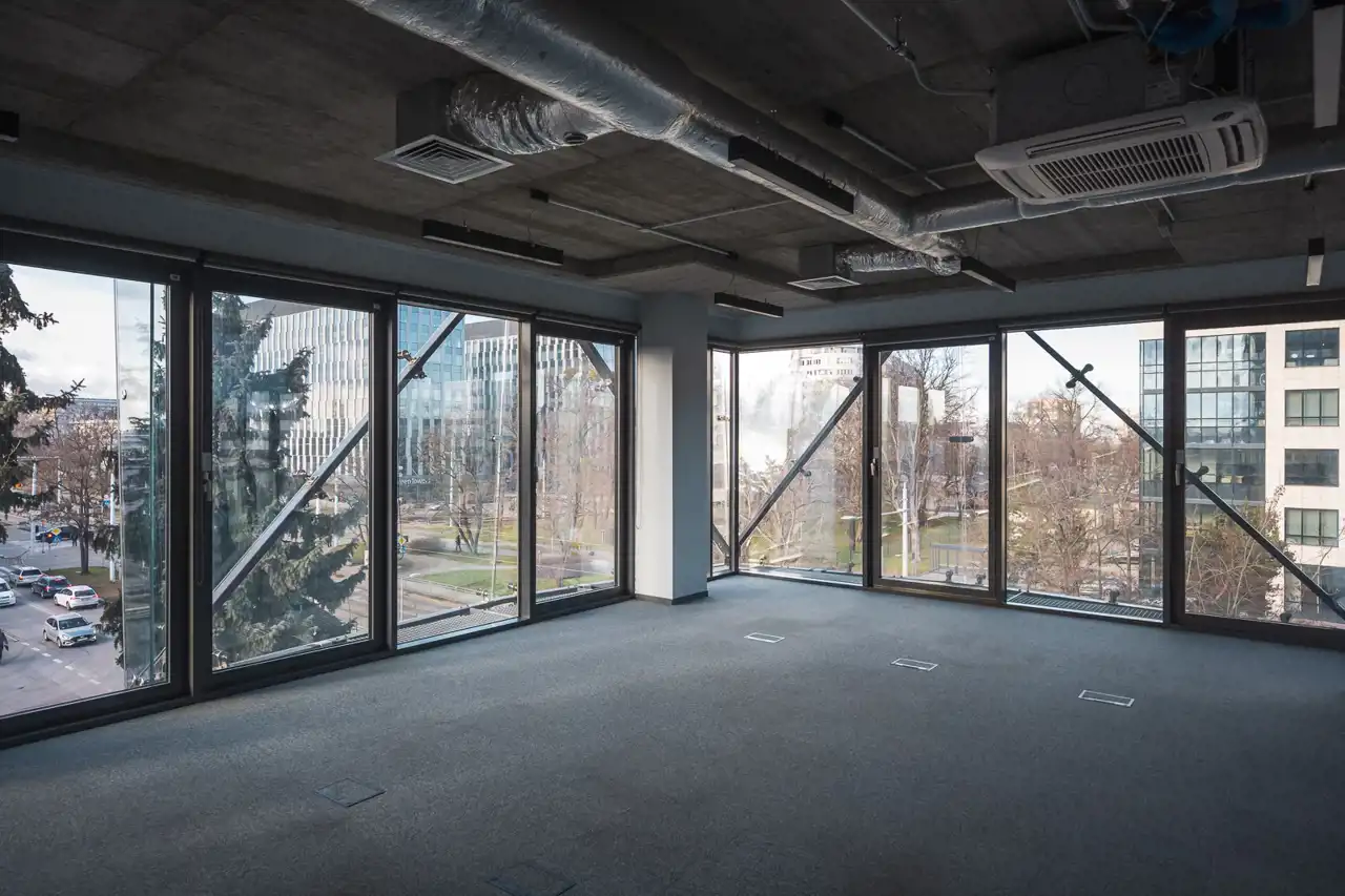 Układ przestrzeni oparty jest na otwartym planie z możliwością wydzielenia mniejszych pomieszczeń, takich jak sale konferencyjne czy gabinety. Naturalne światło, wpadające przez duże okna sięgające od podłogi do sufitu, zapewnia komfortowe warunki do pracy i podkreśla nowoczesny charakter wnętrza. Przestrzeń wykończona jest w jasnych barwach – białe ściany, podwieszany sufit z oświetleniem i wentylacją – co tworzy profesjonalną i inspirującą atmosferę. Zróżnicowane wykończenie podłóg – polerowane drewno oraz wykładziny – łączy estetykę z funkcjonalnością.