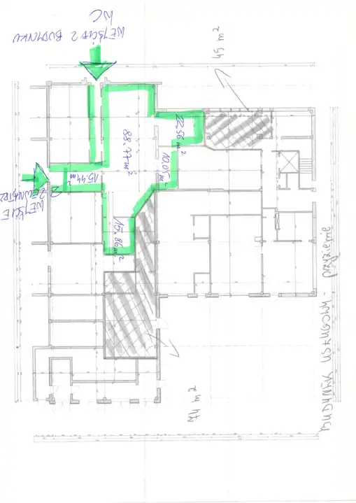 Powierzchnia typu open space 88,77 m2, pomieszczenia dodatkowe.
