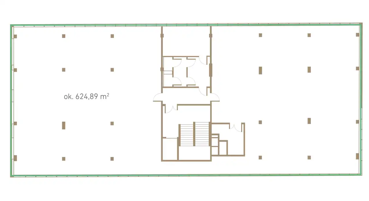 Na parterze znajdują się 2 lokale usługowe o powierzchniach 188,03 m2 oraz 299,39 m2, natomiast na 1 i 2 piętrze dostępne są duże przestrzenie "Open space" o powierzchniach 624,89 m2 oraz 623,89 m2. Te przestrzenie mogą być zaaranżowane zarówno jako jedna duża powierzchnia biurowa, jak i podzielone na dwa oddzielne "Open space" o średniej powierzchni około 312 m2 przeznaczone do własnej aranżacji.