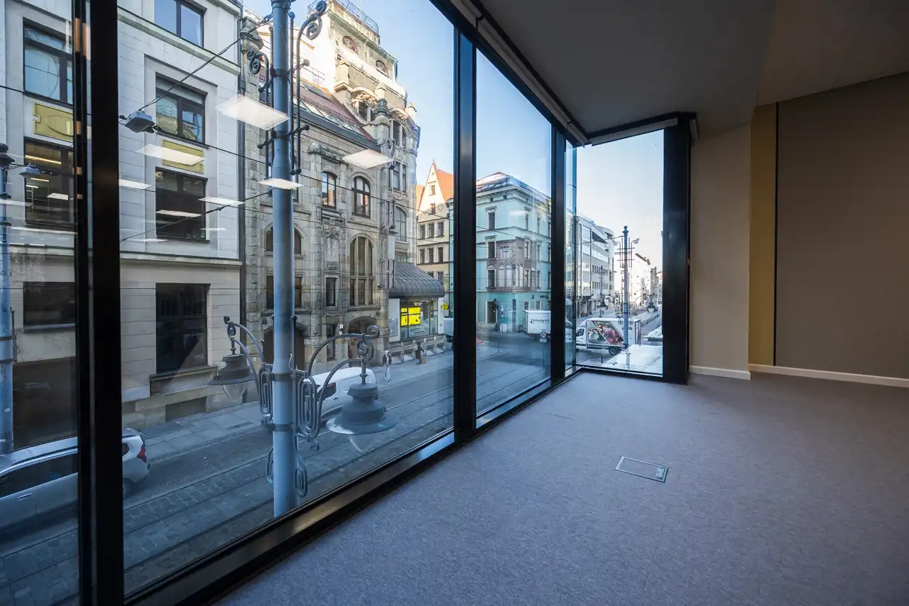 Przestrzeń typu open space z dużymi przeszkleniami, oferująca widok na ul. Szewską — jedną z najbardziej rozpoznawalnych i uczęszczanych ulic w obrębie ścisłego centrum.