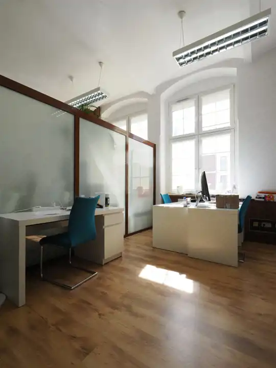 Hol, pięć gabinetów ,salka konferencyjna. aneks kuchenny, toaleta.