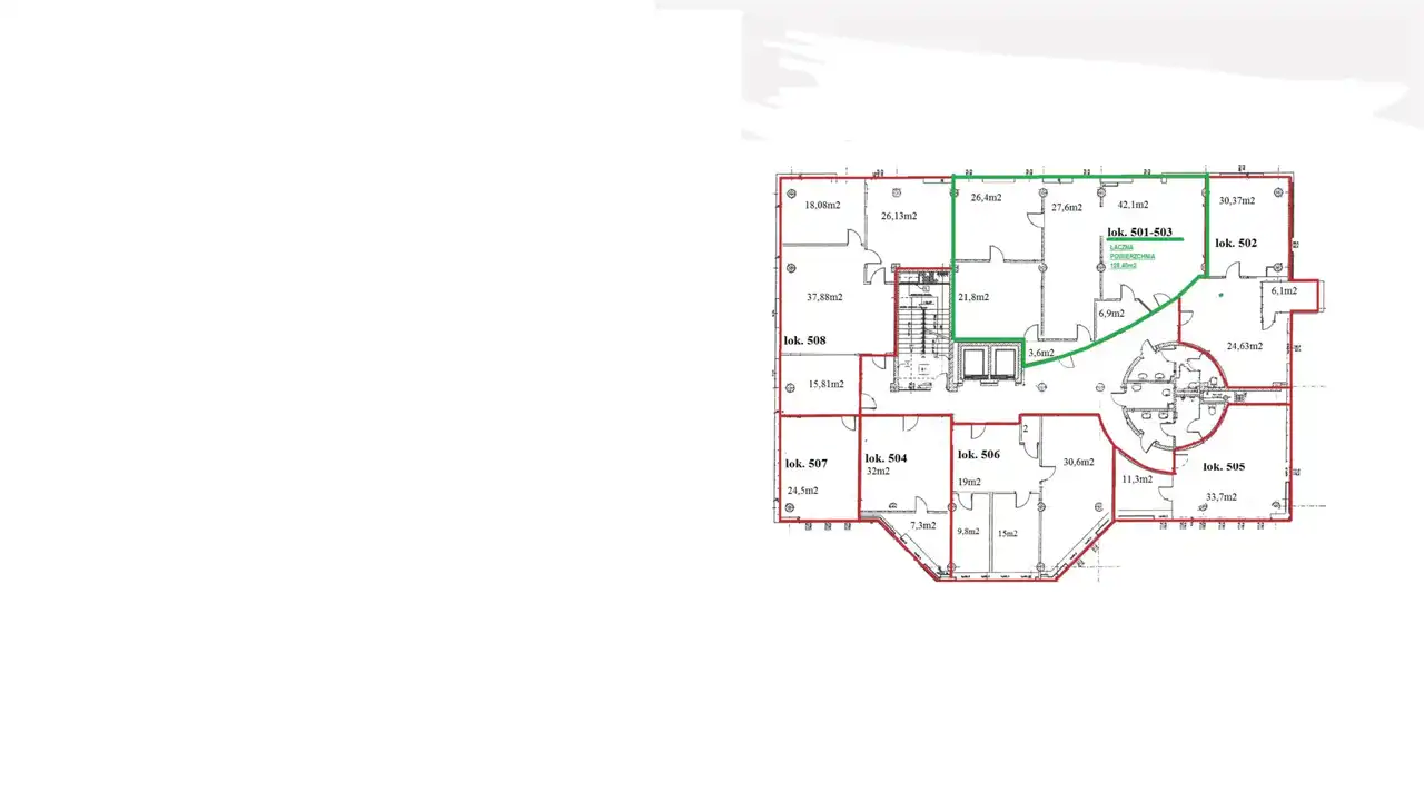 • Lokal z podziałem na pokoje: 26,40 m2 , 21,80 m2 , 27,60m2, 42,10m2, 6,9m2