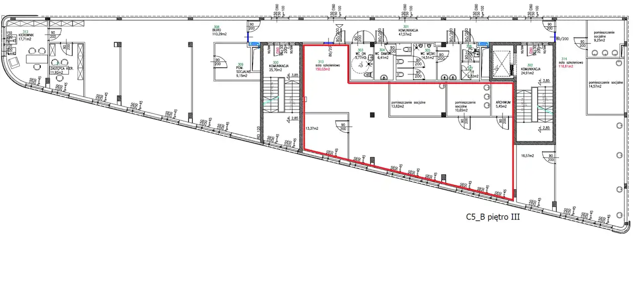 107 m2 open space, gabinet 13,37 m2, przeszklona salka13,62 m2, dwa pomieszczenia bez okna 10,65 i 5,45 m2